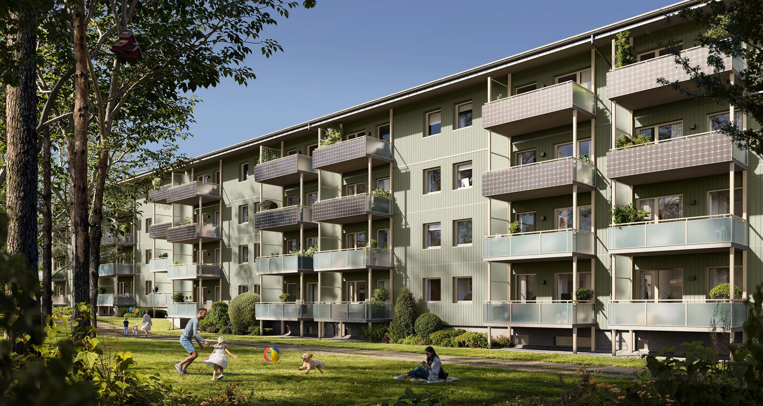 Vorstellbalkone schaffen zusätzlichen Wohnkomfort, teilweise mit PV-Module an den Brüstungen. Auch die Außenanlagen werden neu gestaltet und Stellplätze mit E-Ladesäulen ergänzt.