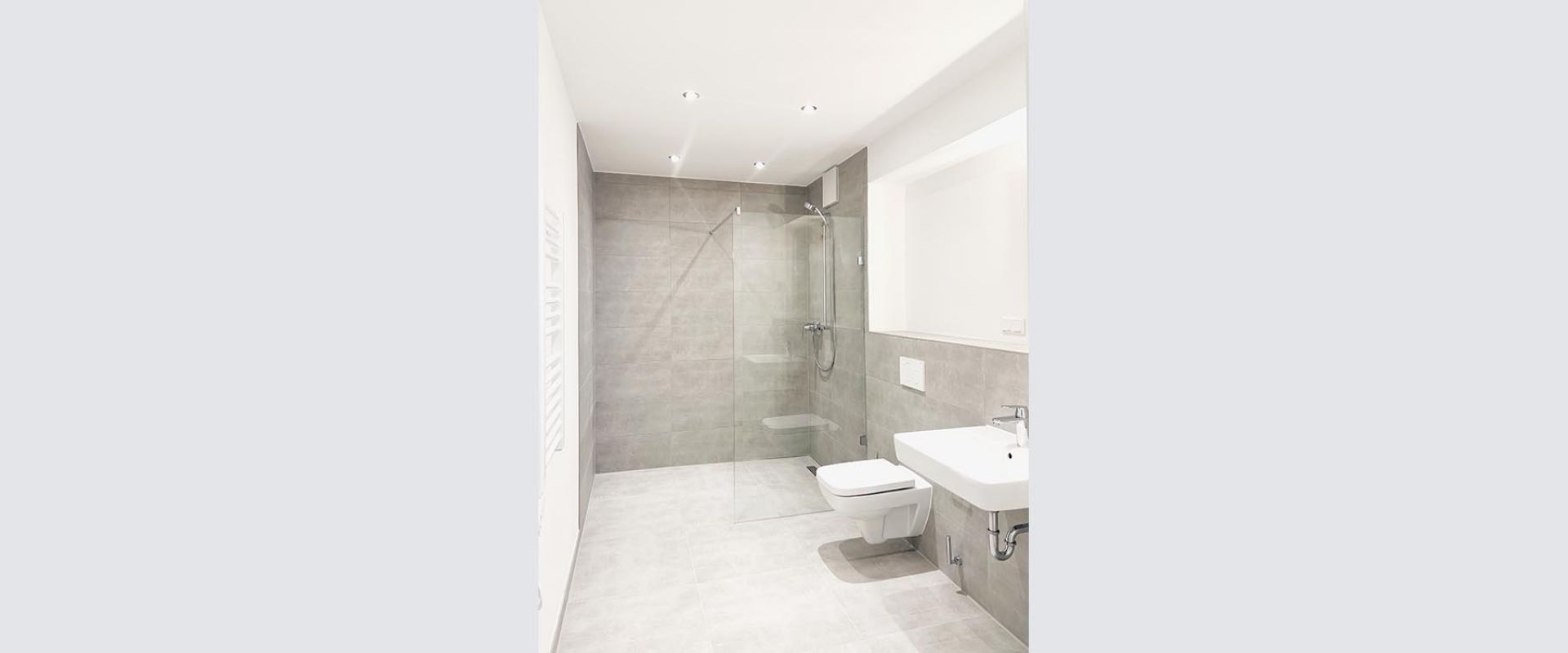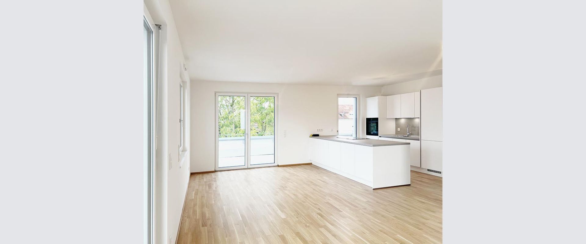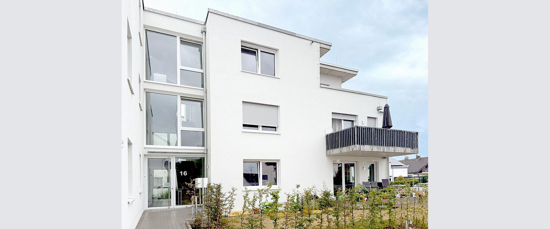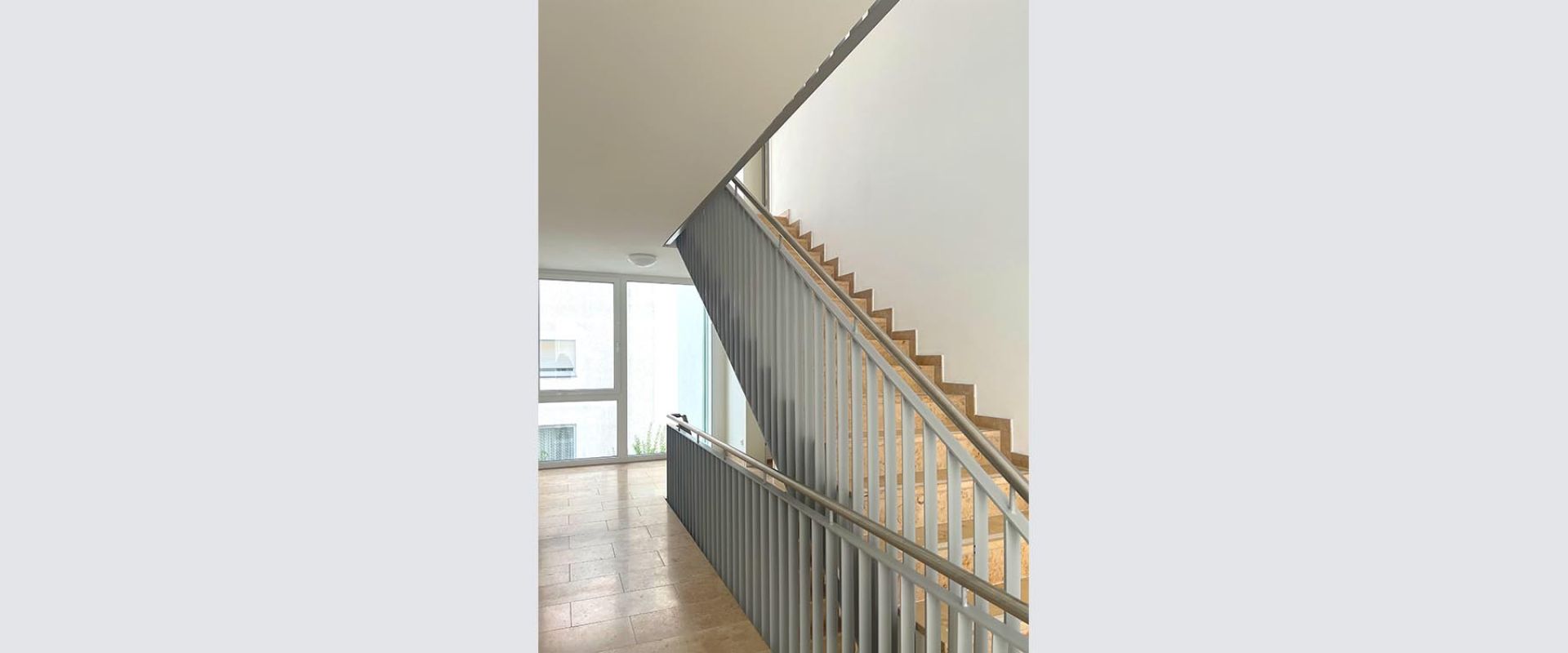 Der natürliche Geländeversprung des Grundstücks wird genutzt, um Stellplätze dezent im rückwärtigen Bereich unterzubringen – eine Tiefgarage ist nicht erforderlich. Die beiden Erdgeschosswohnungen verfügen über private Freiflächen, alle weiteren Einheiten über großzügige Balkone oder Dachterrassen. Der Zugang erfolgt barrierefrei über eine Rampe am Haupteingang, die zusätzlich fünf Fahrradstellplätze integriert.