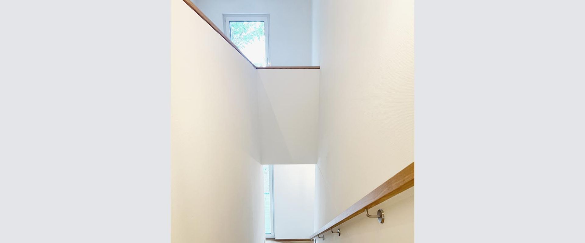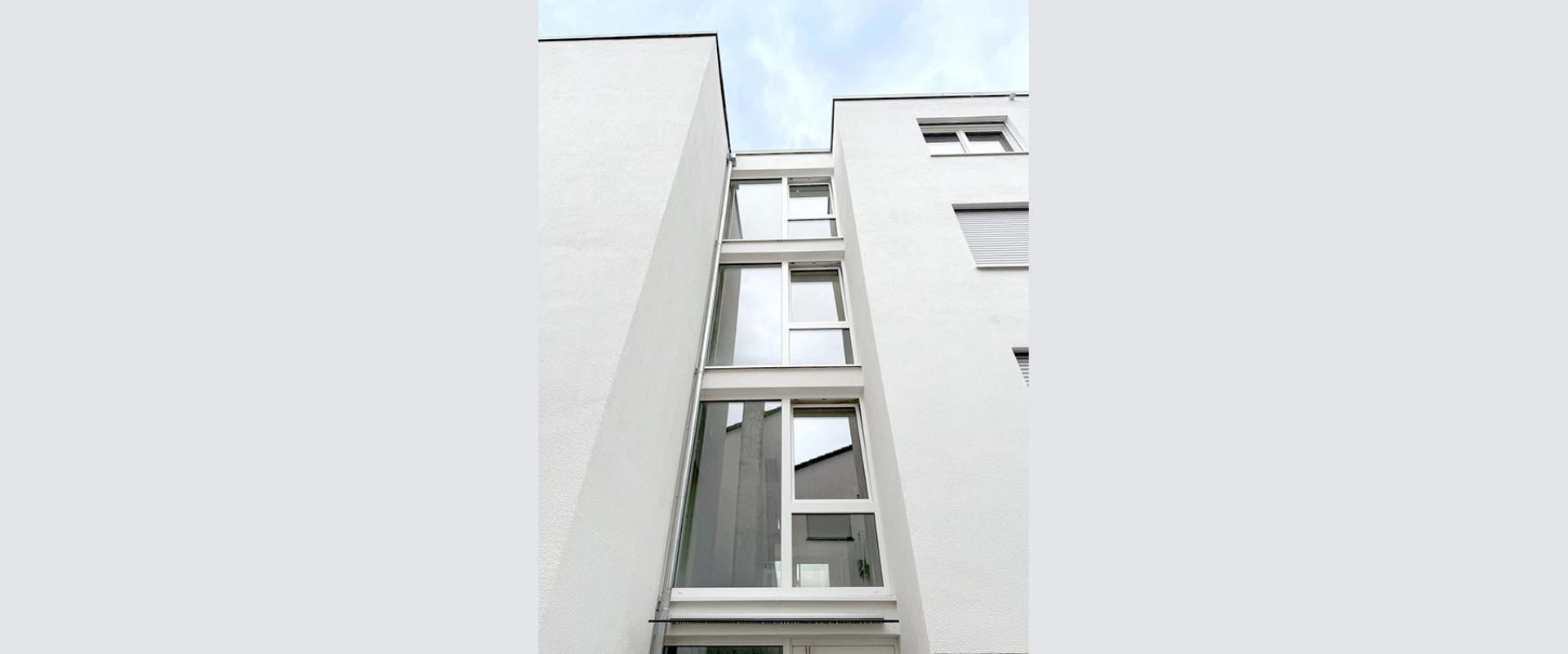 Der Baukörper wird durch eine Fuge in zwei versetzt zueinander stehende Volumen gegliedert. Diese Anordnung ermöglicht eine optimale Belichtung der Wohnungen, schafft angemessene Abstände zur Nachbarbebauung und nimmt Rücksicht auf die bestehende Struktur. Die Fuge fungiert als zentrales, natürlich belichtetes Treppenhaus und erschließt acht Wohneinheiten über zwei Vollgeschosse und ein Staffelgeschoss – barrierefrei per Treppe und Aufzug.