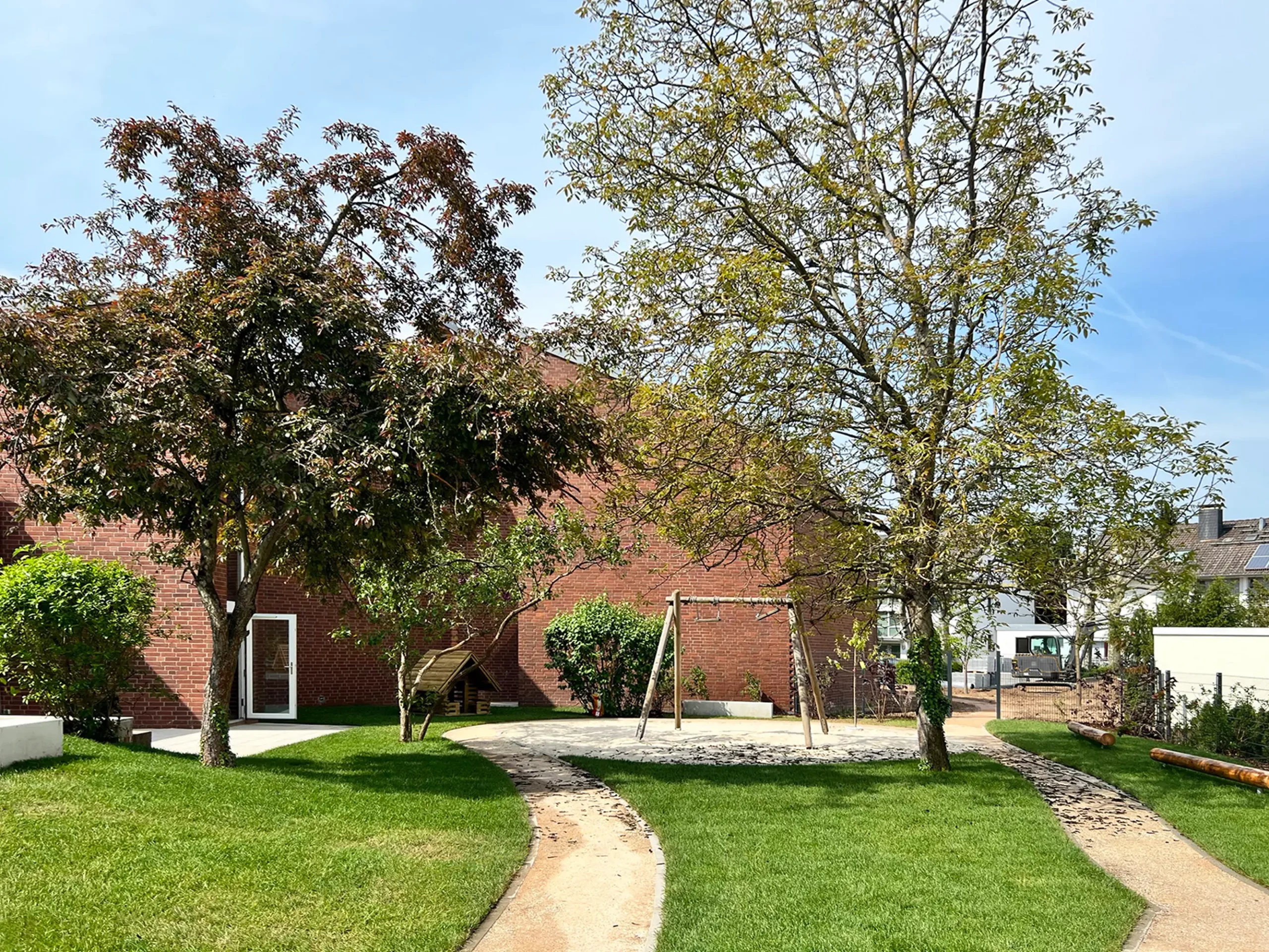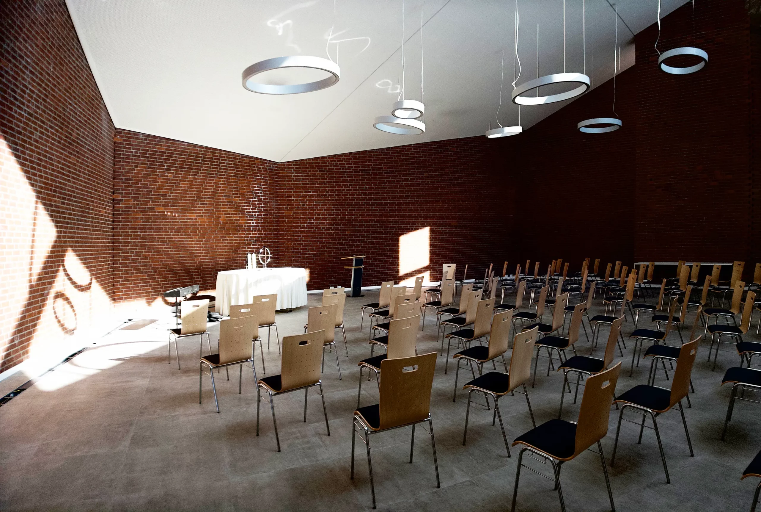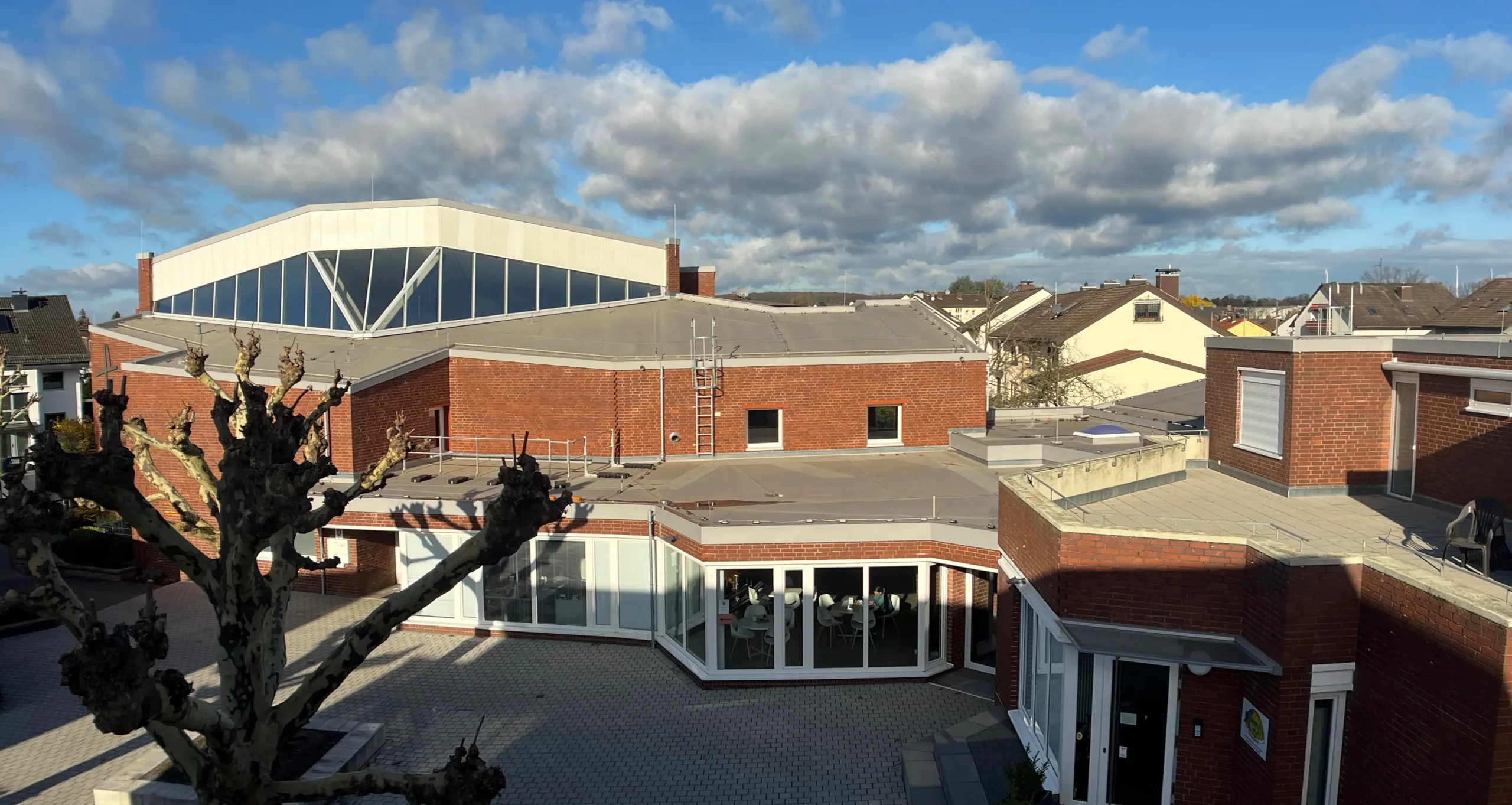 Das Gebäudeensemble aus dem Jahr 1974 – bestehend aus Gemeindezentrum, Pfarrhaus und Kindergarten – gruppiert sich um einen geschützten Innenhof. Durch die Umnutzung entstand ein zeitgemäßer Ort für Begegnung, Bildung und Gemeindeleben.