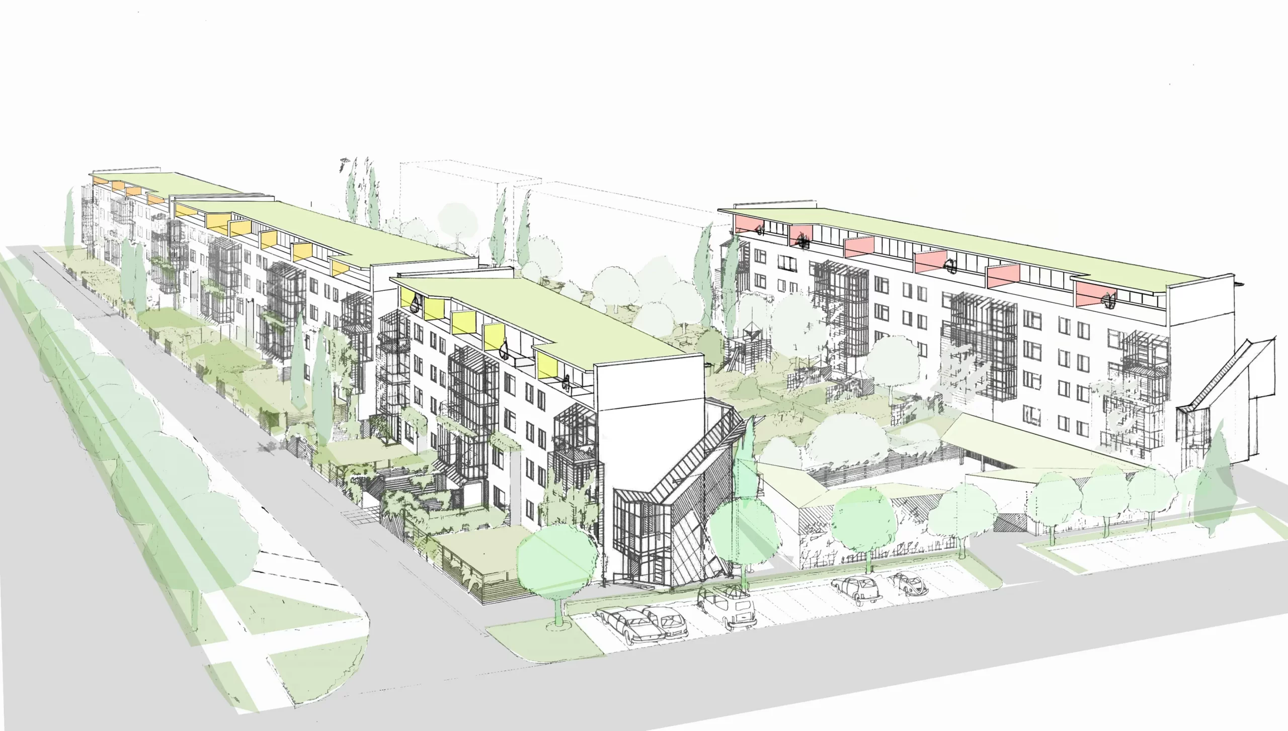 Durch Aufstockungen entstehen 20 neue Wohnungen, ergänzt durch barrierefreie Aufzüge und begrünte Dächer. So wird nicht nur Wohnraum erweitert, sondern auch der ökologische Fußabdruck reduziert: