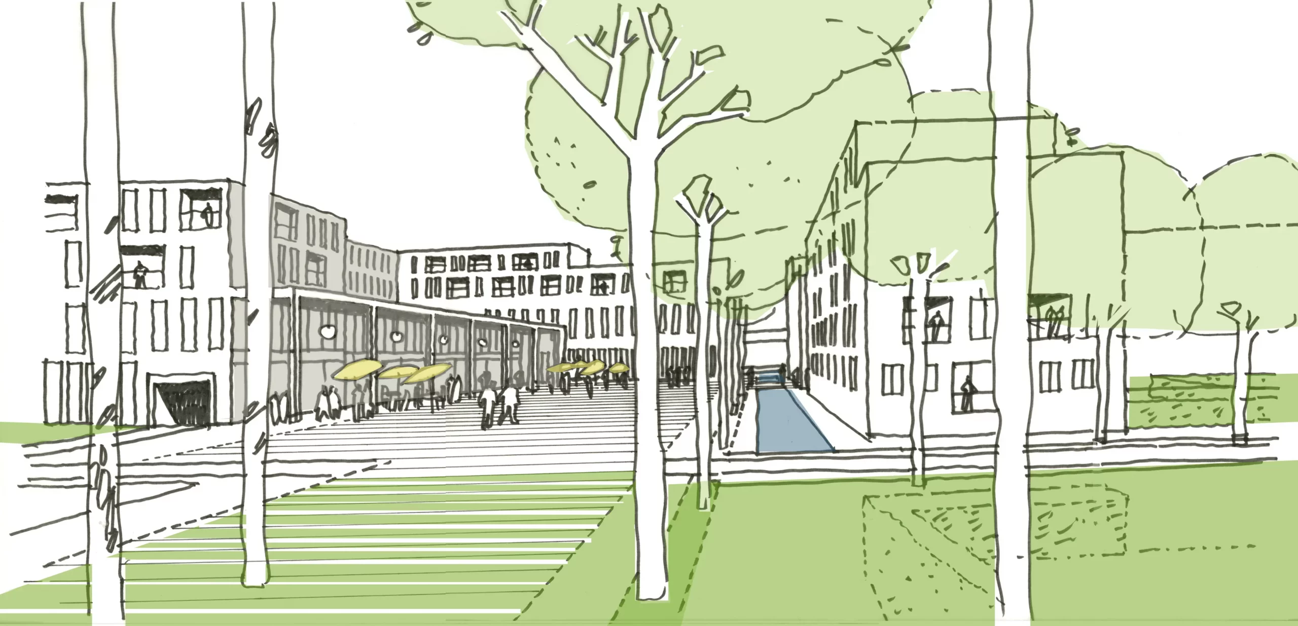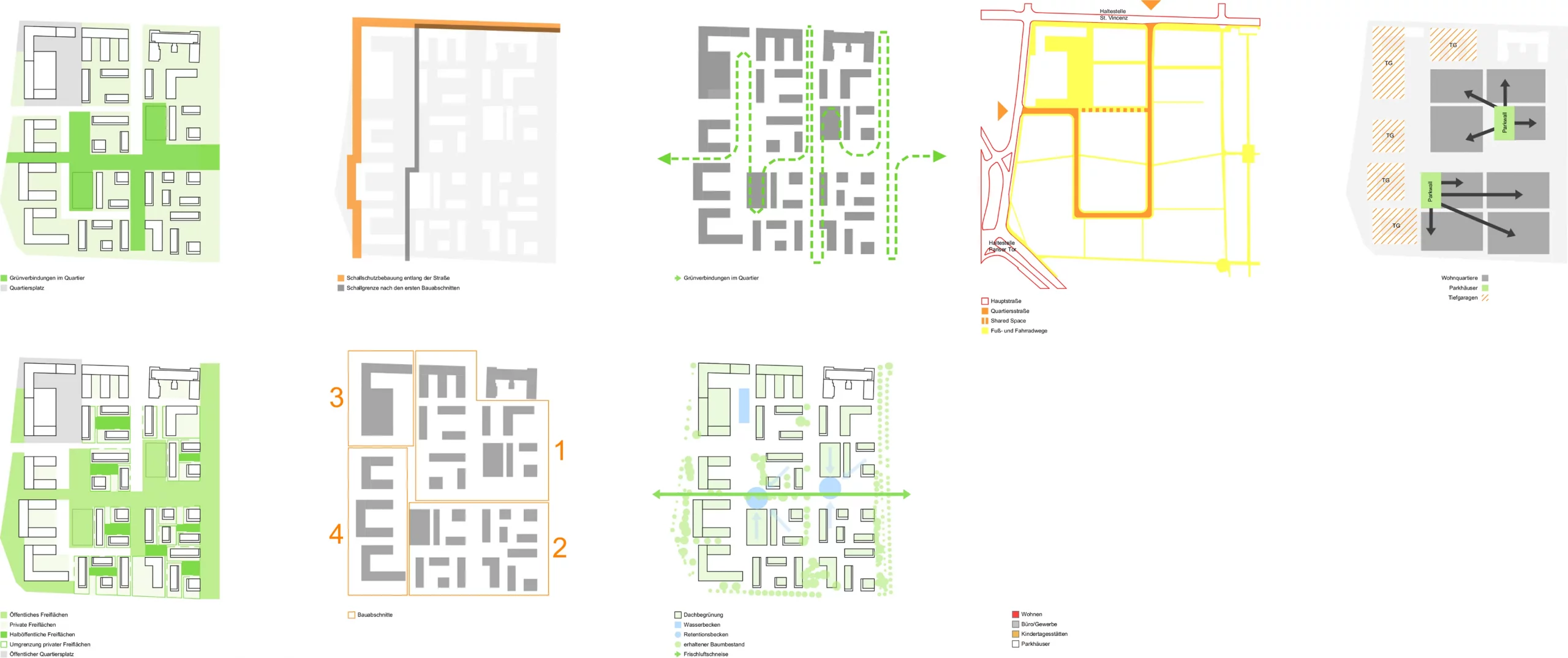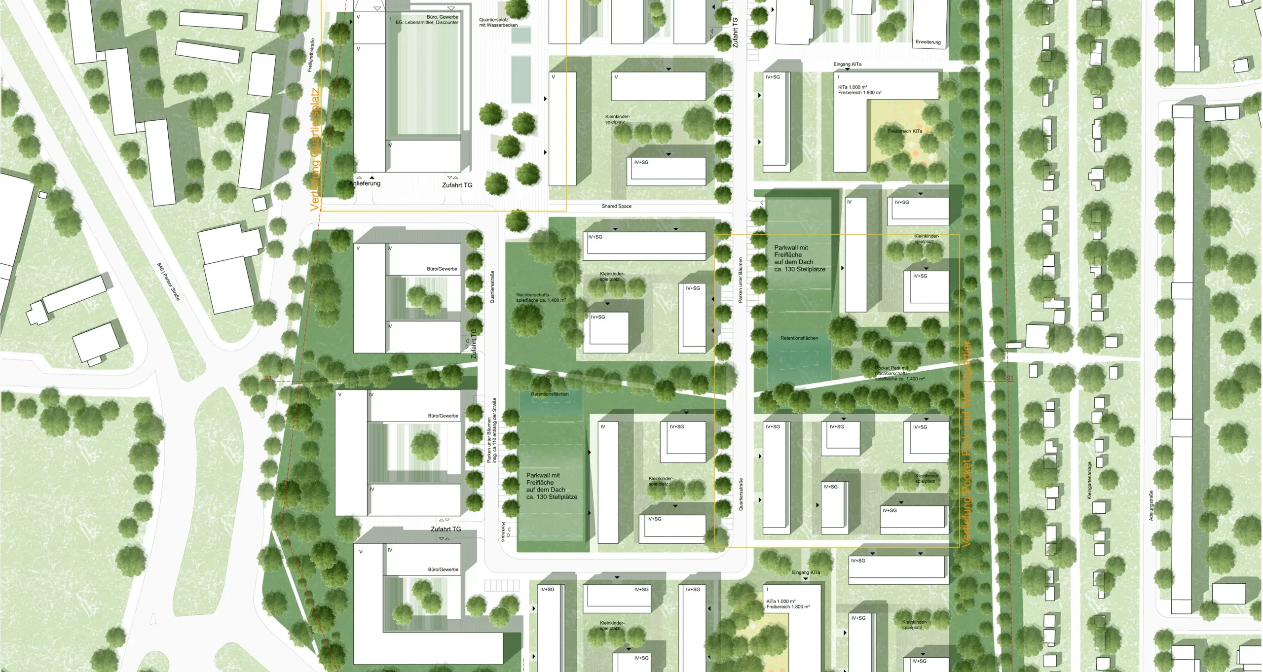 Ein prägnanter Quartiersplatz markiert den Eingang im Nordwesten. Fünfgeschossige Gewerbebauten schirmen das Quartier vom Verkehrslärm ab. Wohnhöfe mit Zeilen und Solitären gruppieren sich entlang eines orthogonalen Rasters um einen durchgehenden Landschaftspark in Ost-West-Richtung.
