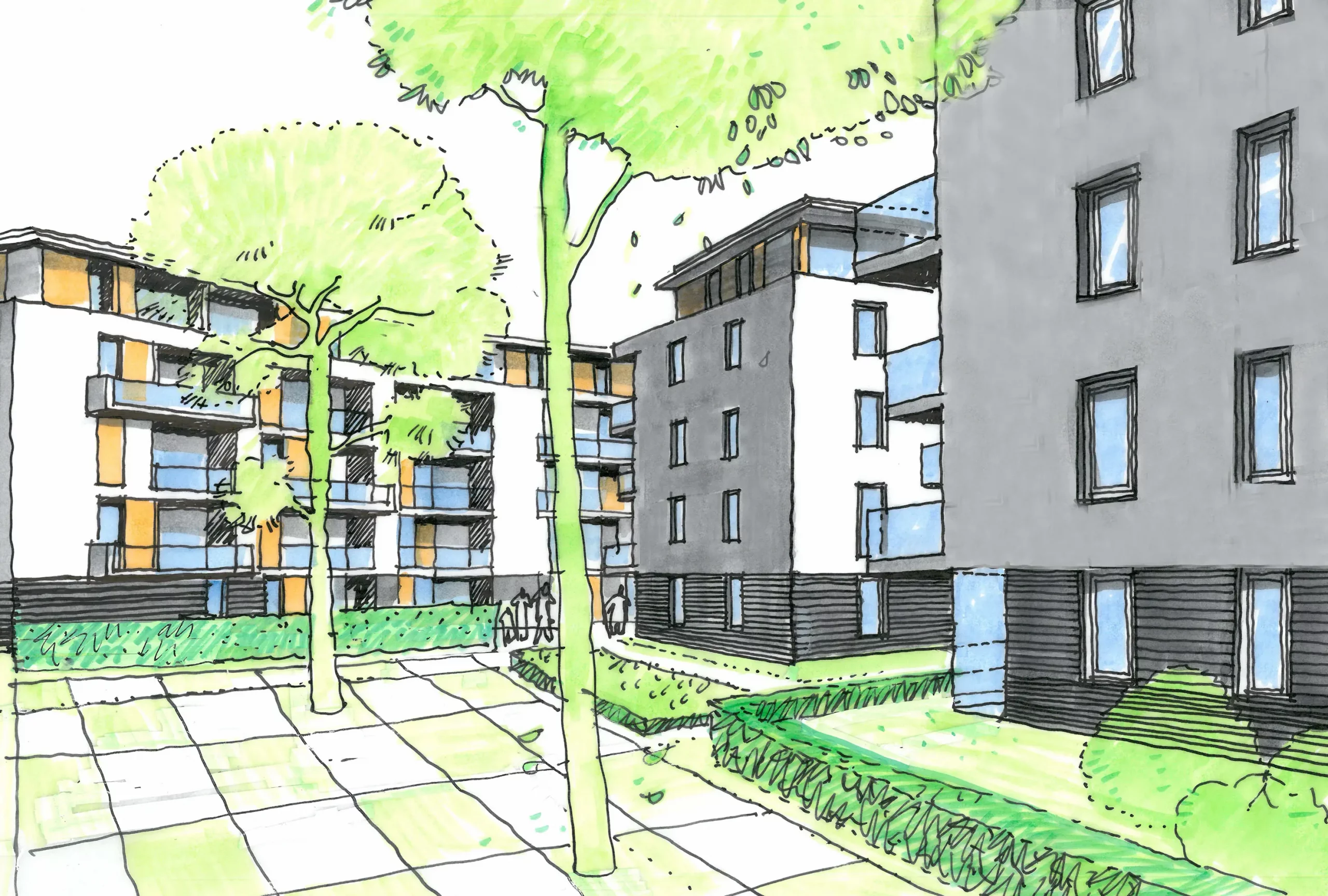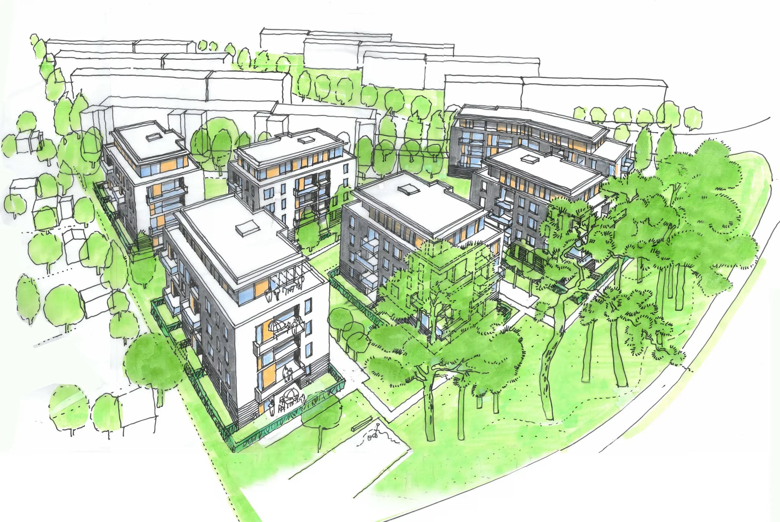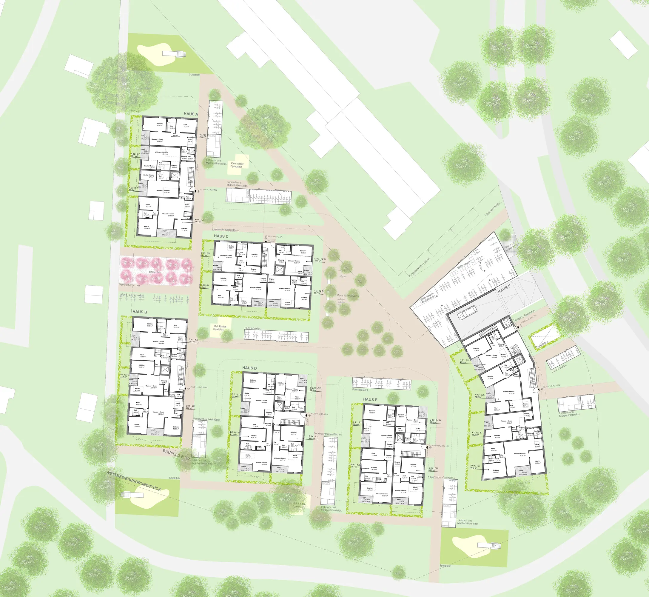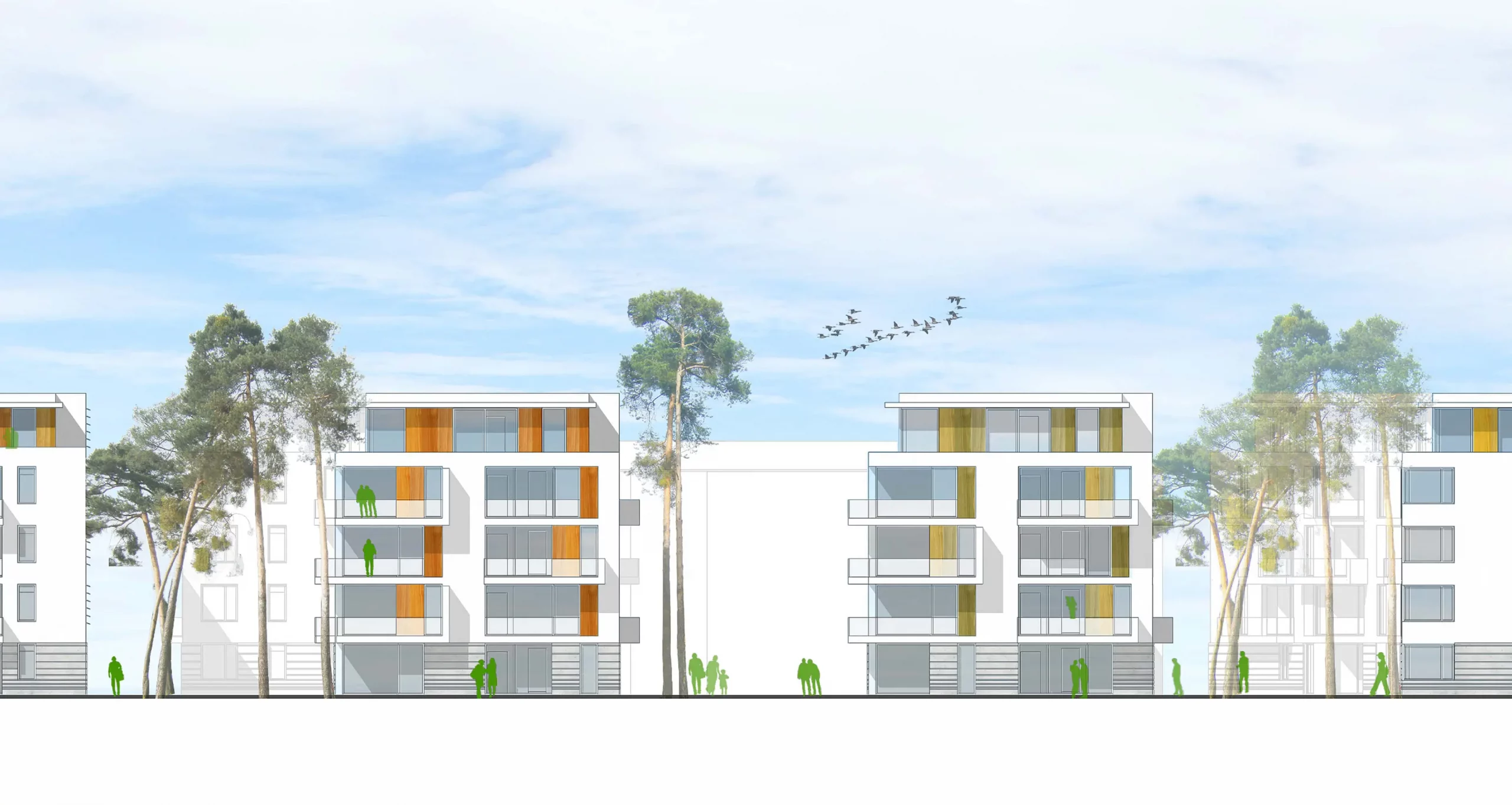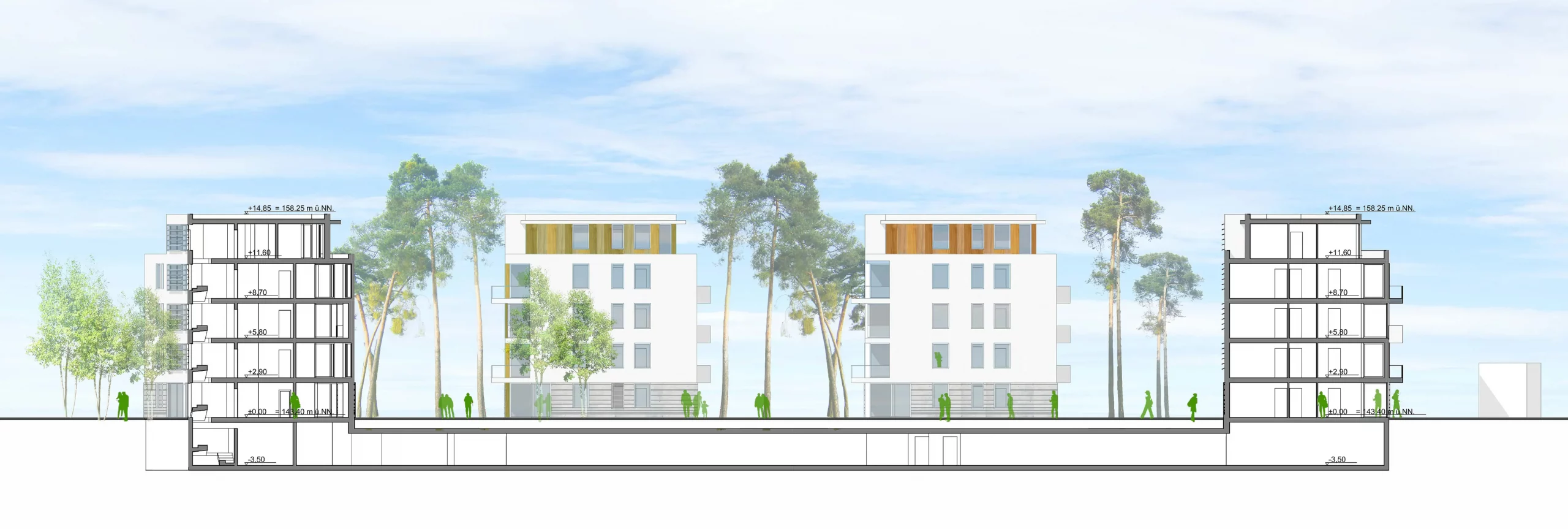 Die diagonal ausgerichteten Wohnzeilen werden in eine orthogonale Struktur überführt. Zusammen mit der Bebauung des zentralen Quartiersplatzes entsteht ein städtebaulicher Rahmen, der den südlichen Stadtteilabschnitt klar definiert. Der östliche Baukörper vermittelt zwischen beiden Ausrichtungen und dient als Schallschutz, während drei weitere längsgerichtete Gebäude den Abschluss des Quartiers bilden und breite Freiräume schaffen, die den Innenhof mit dem Wald verbinden.
