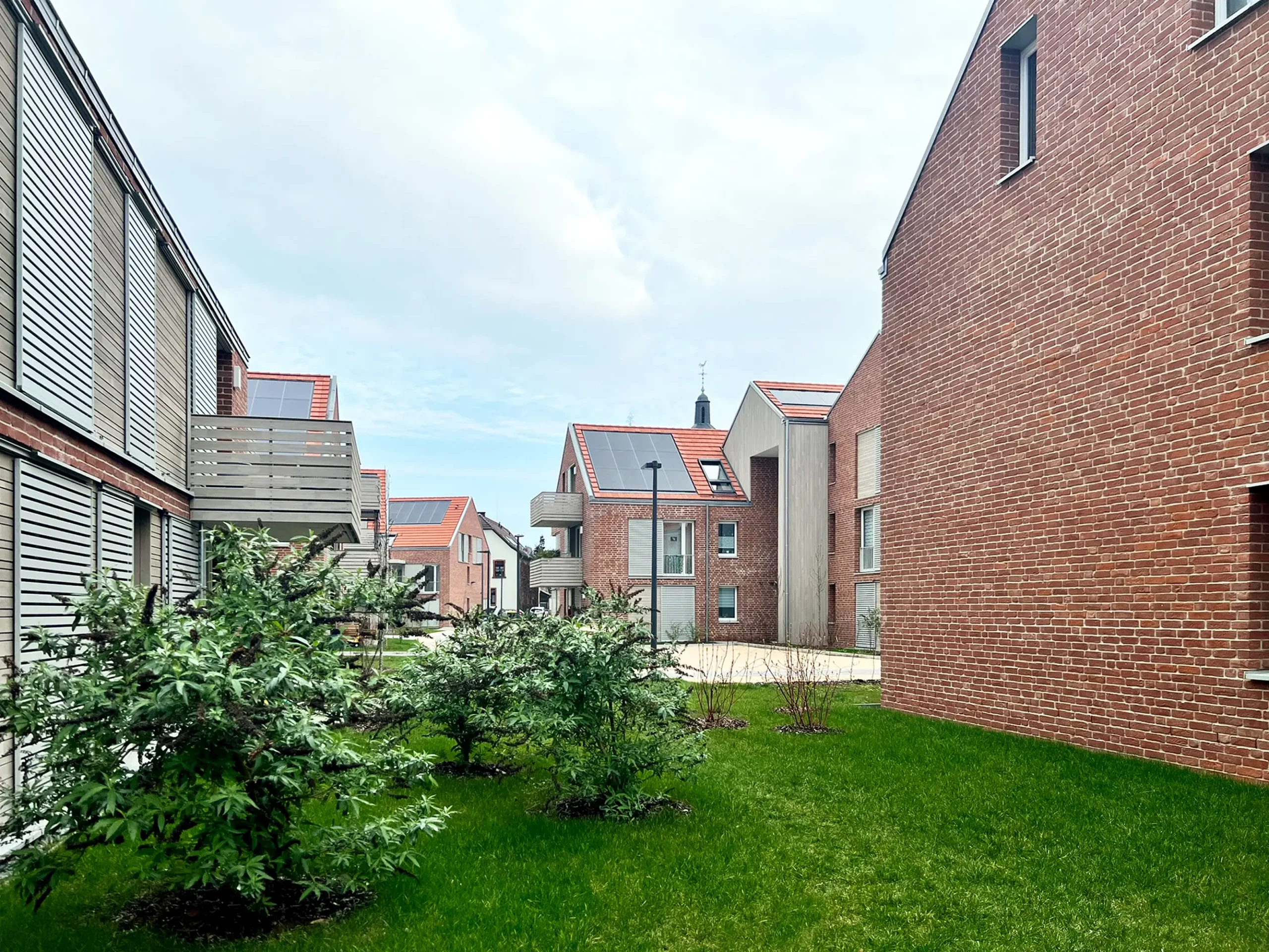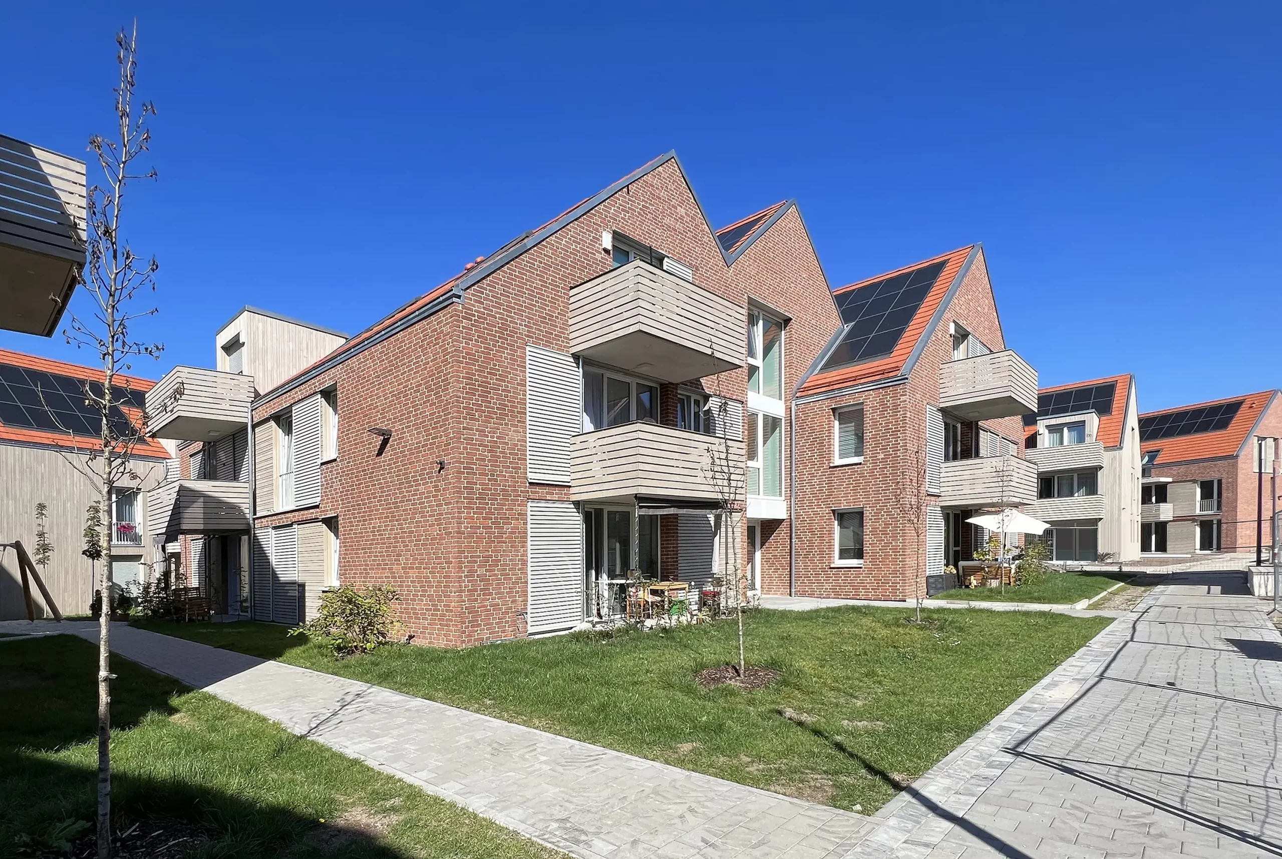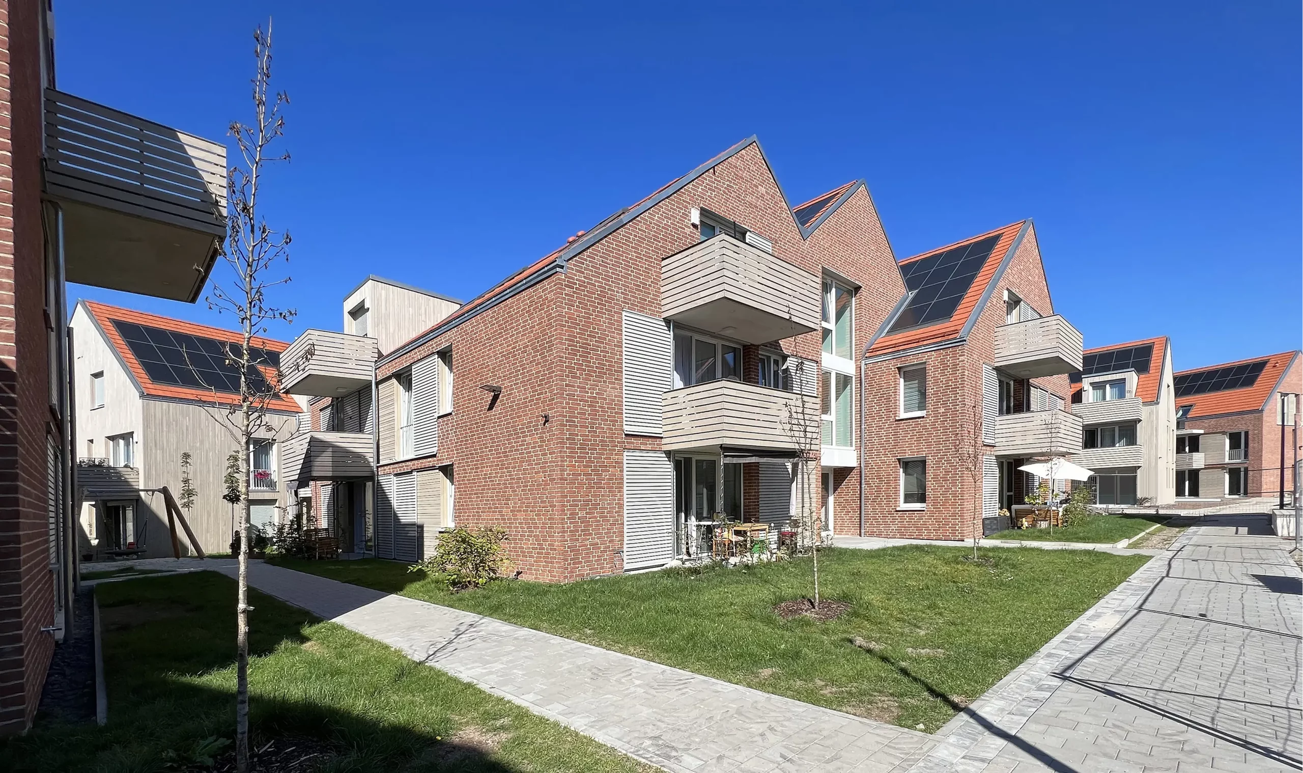 Das Quartier wurde im KfW-40-Standard errichtet und verfügt über eine zentrale Hackschnitzelheizung sowie Photovoltaikanlagen auf den Dächern. Ein integriertes Mieterstrommodell versorgt die Bewohner:innen mit lokal erzeugtem, erneuerbarem Strom und verbindet ökologische Verantwortung mit wirtschaftlicher Effizienz. Niedrige Betriebskosten, die Unabhängigkeit von fossilen Energien und die Wertstabilität durch hohe Energieeffizienz machen das Energiekonzept ökologisch und ökonomisch sinnvoll.