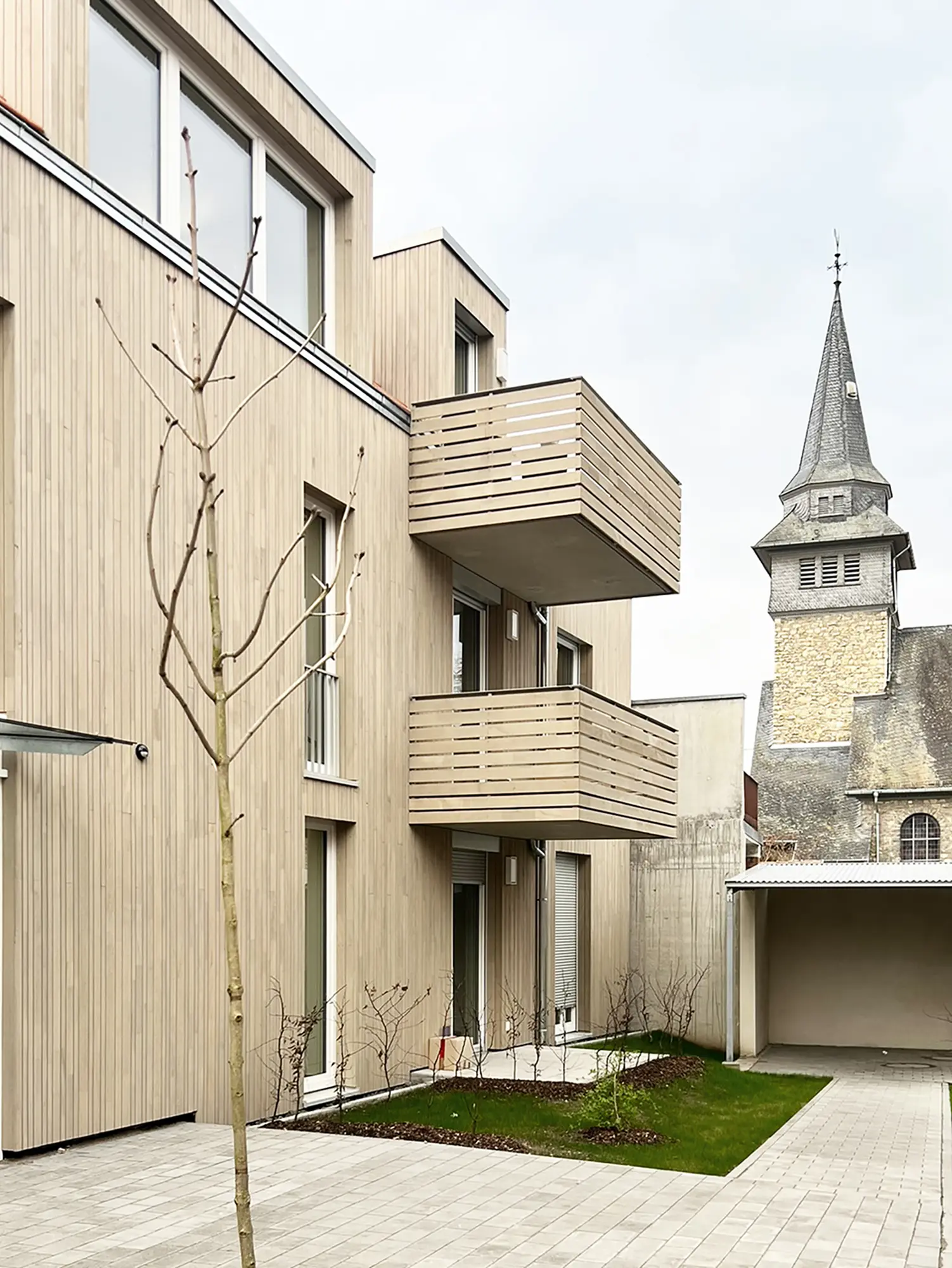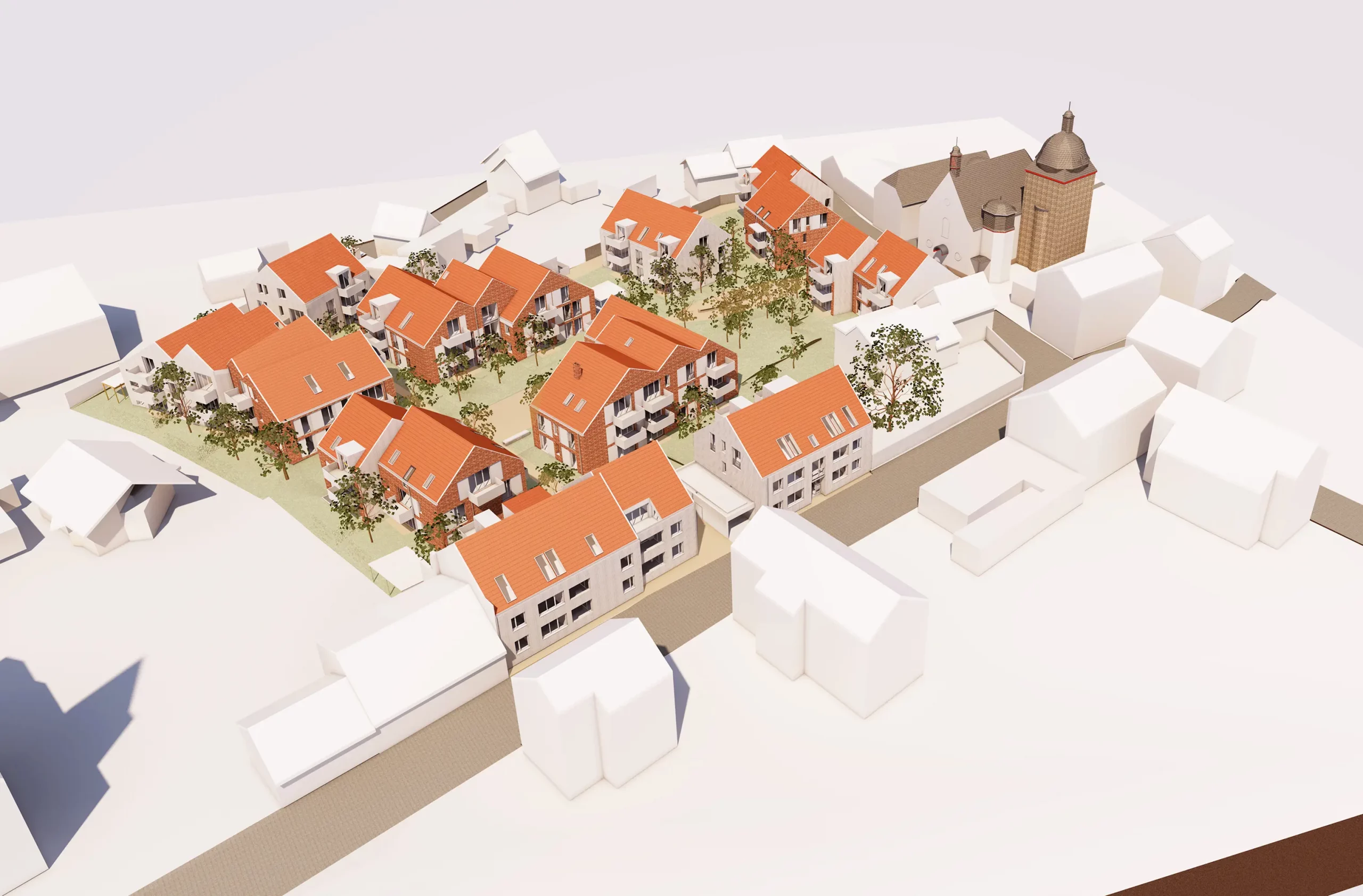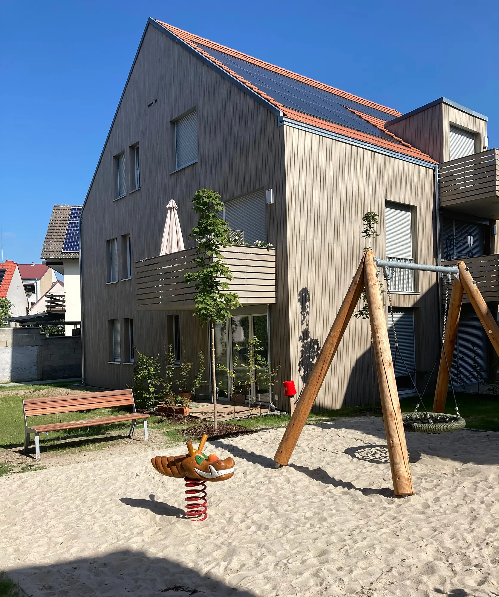 Das Quartier wurde im KfW-40-Standard errichtet und verfügt über eine zentrale Hackschnitzelheizung sowie Photovoltaikanlagen auf den Dächern. Ein integriertes Mieterstrommodell versorgt die Bewohner:innen mit lokal erzeugtem, erneuerbarem Strom und verbindet ökologische Verantwortung mit wirtschaftlicher Effizienz. Niedrige Betriebskosten, die Unabhängigkeit von fossilen Energien und die Wertstabilität durch hohe Energieeffizienz machen das Energiekonzept ökologisch und ökonomisch sinnvoll.