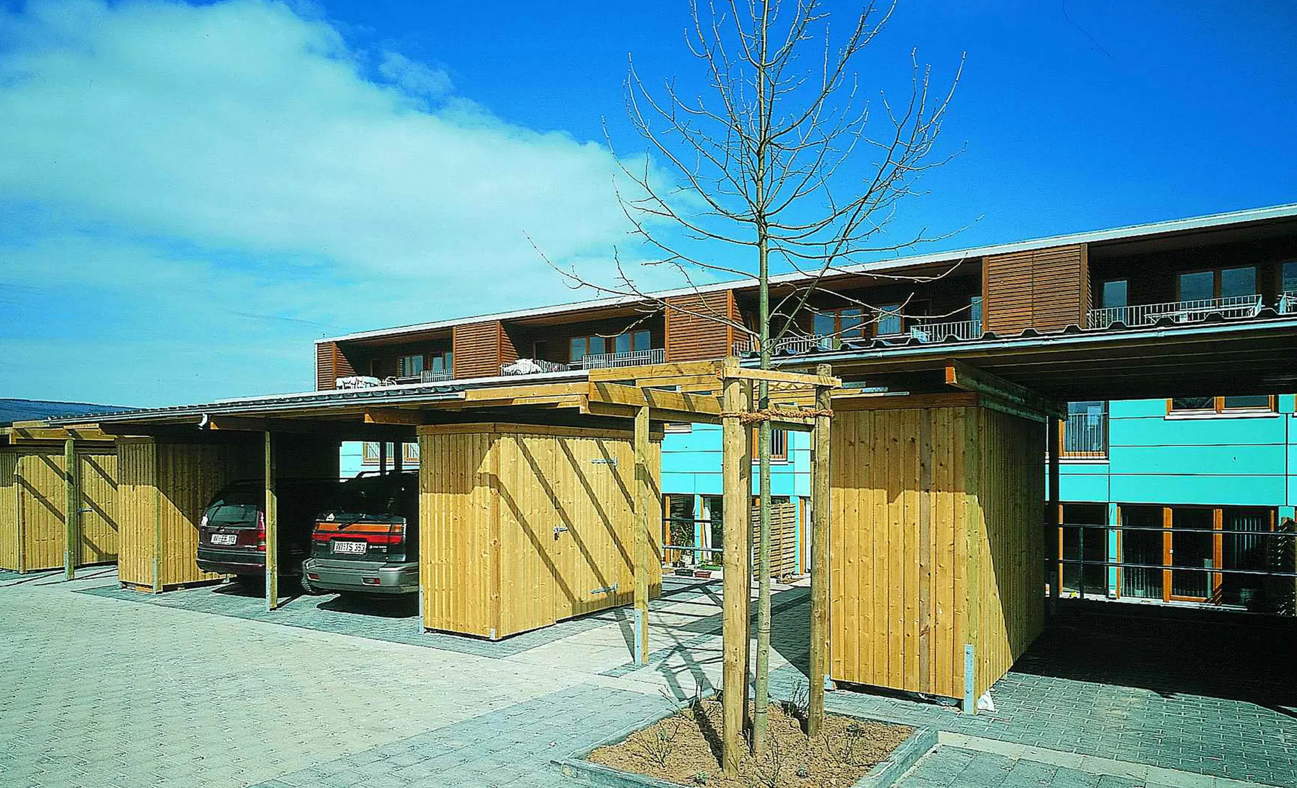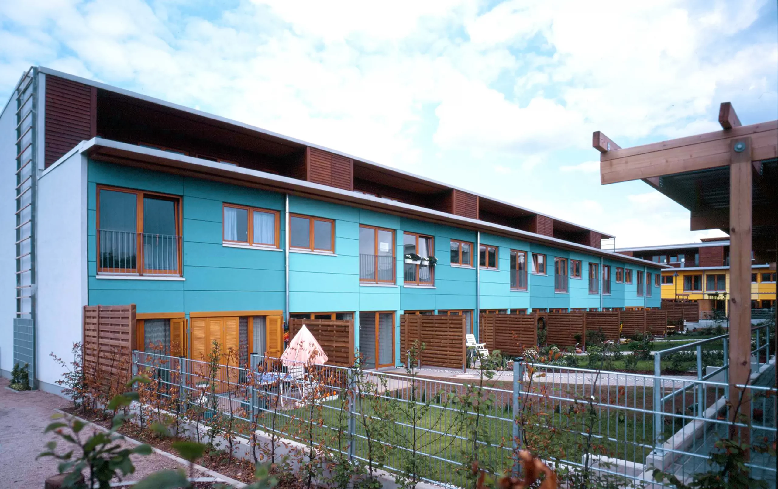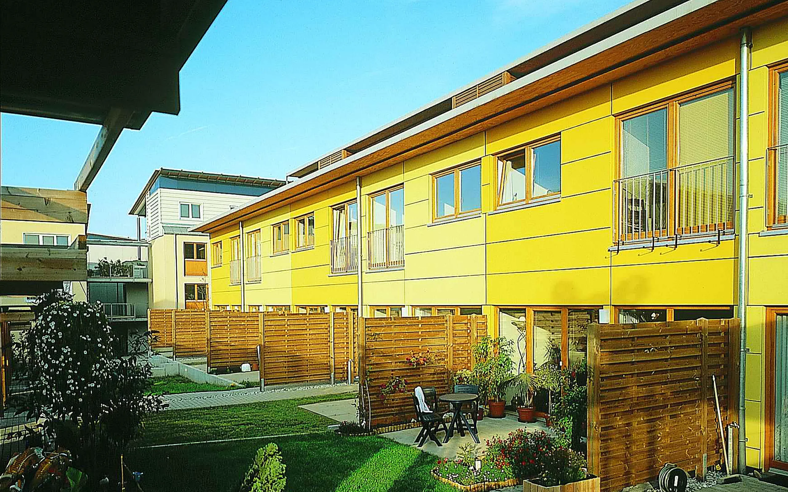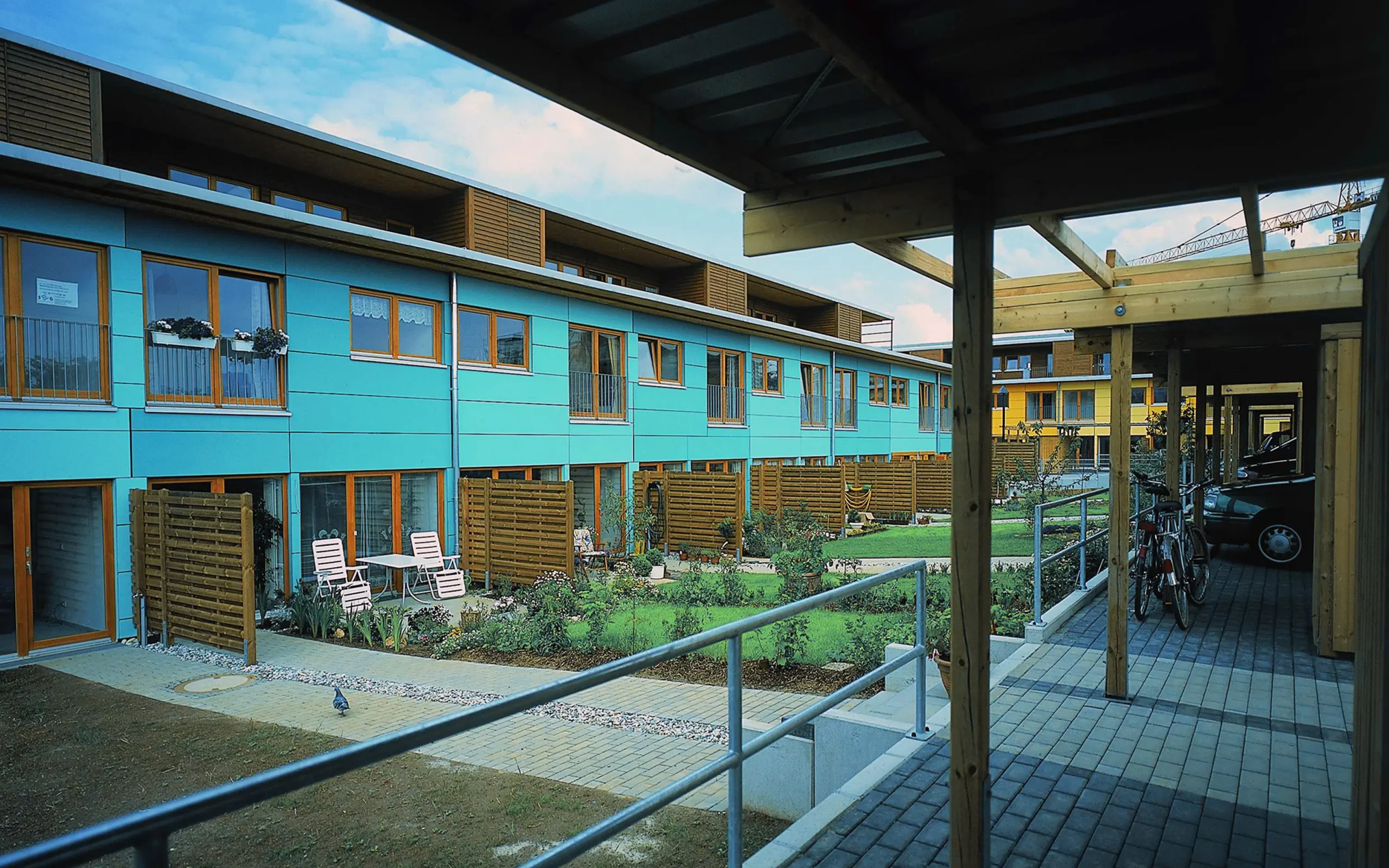 Die Häuser gruppieren sich in Hufeisenform um einen gemeinschaftlichen Hof. Es entstanden drei Haustypen: