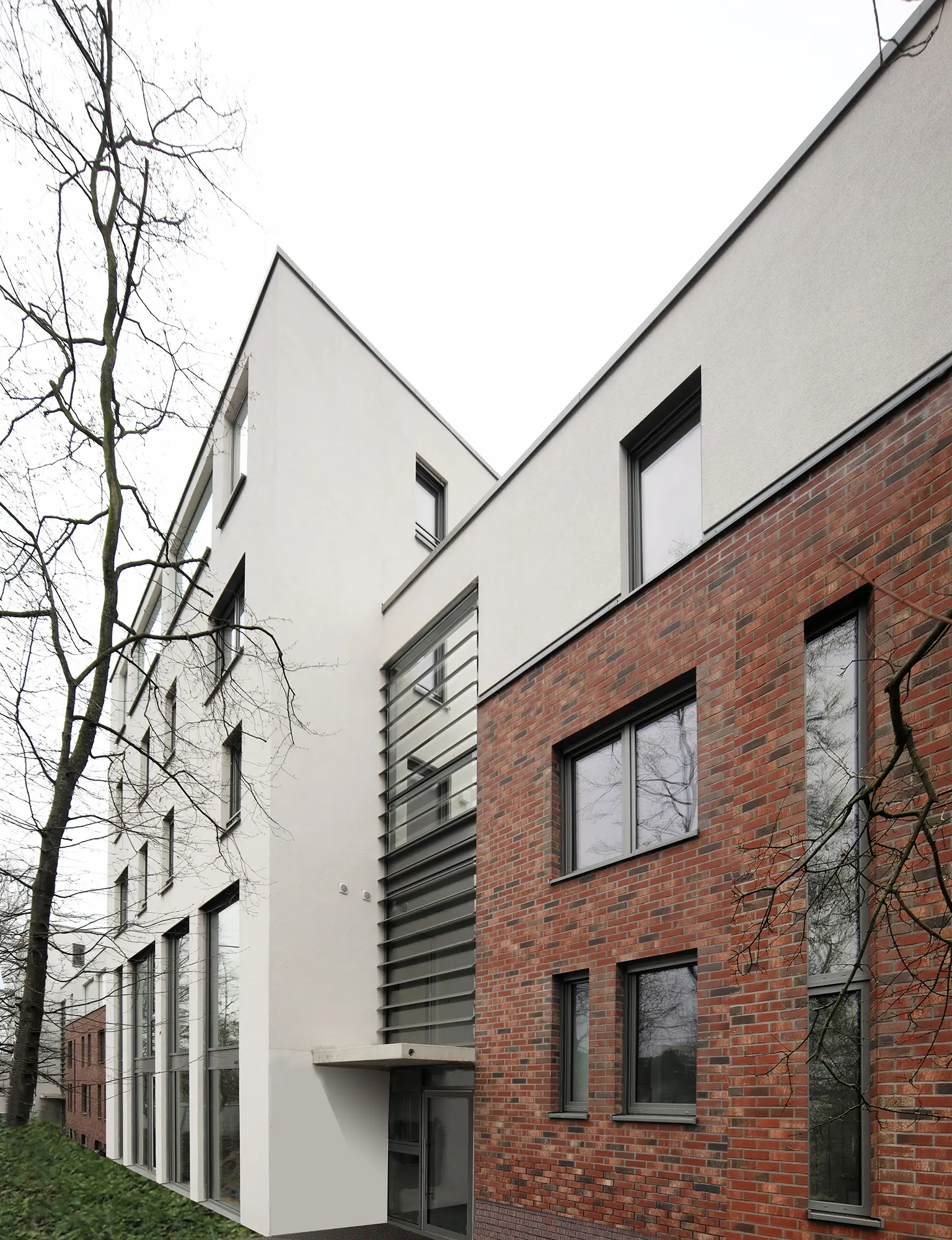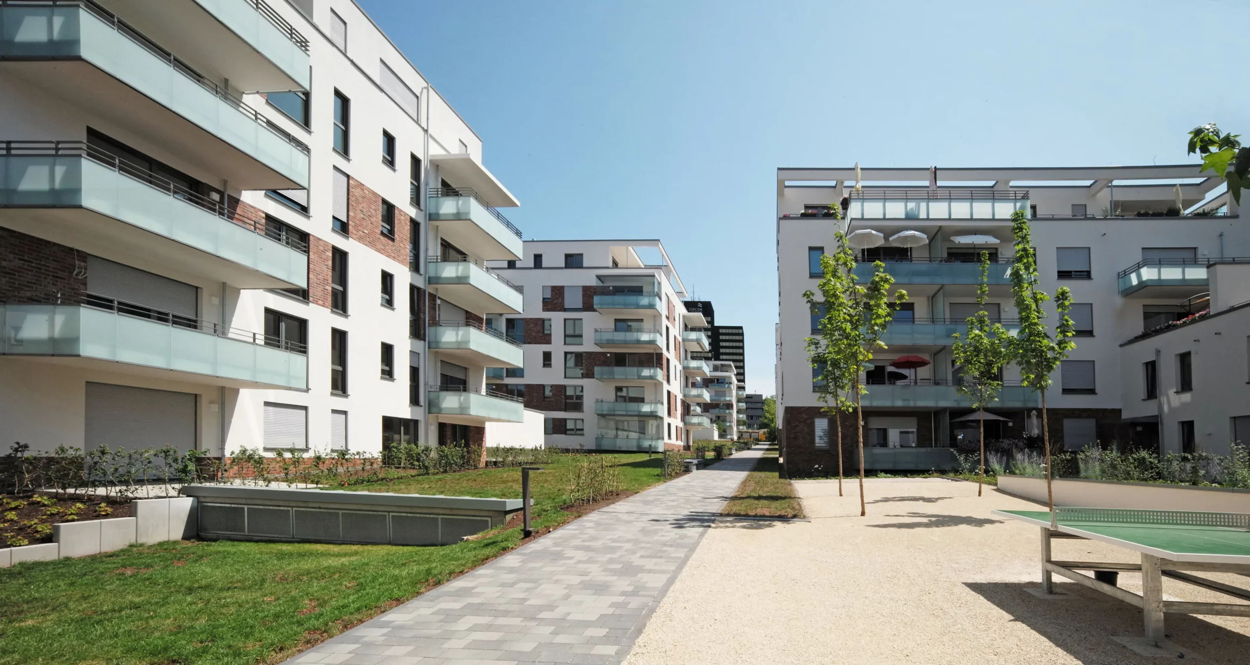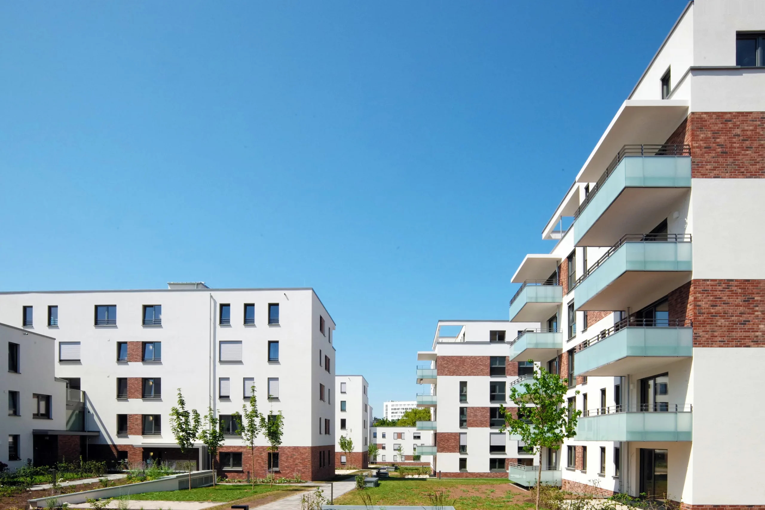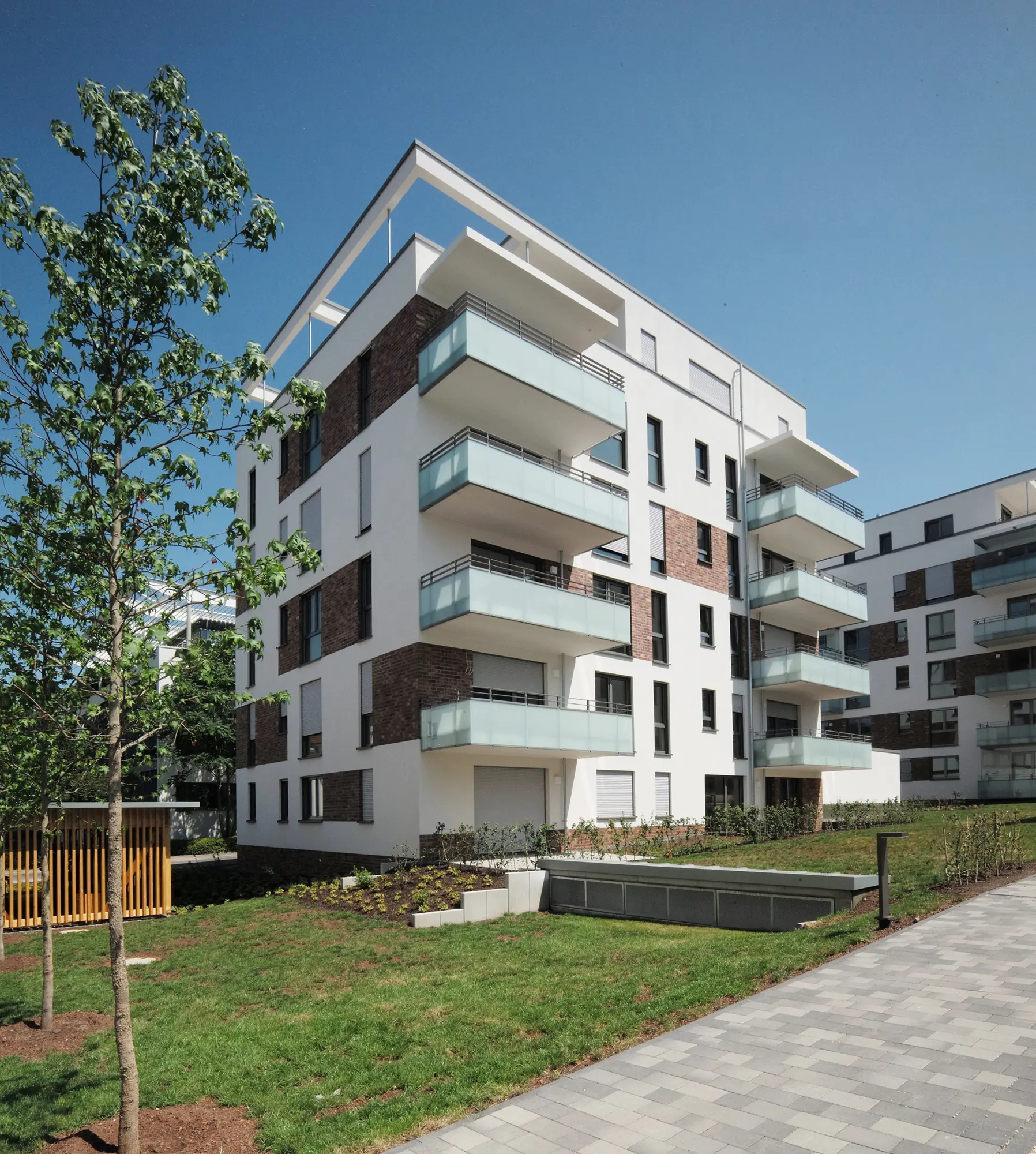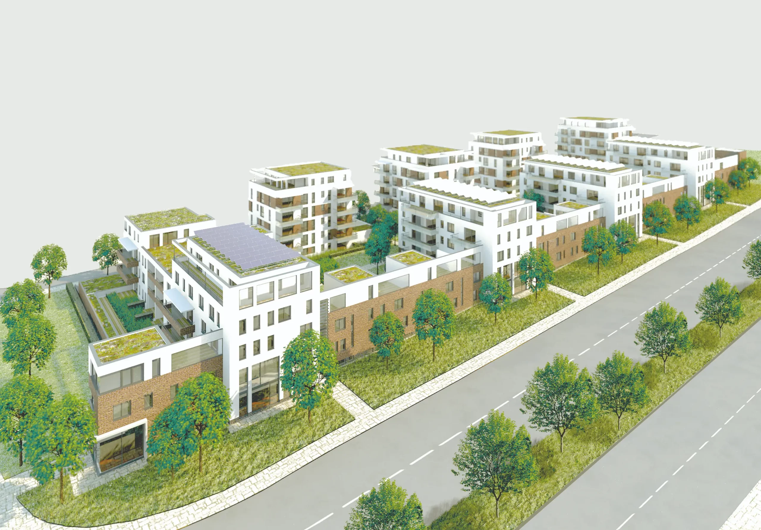 Das Quartier bietet ein vielfältiges Wohnangebot: barrierefreie Wohnungen, altersgerechte Einheiten, familienfreundliche Stadthäuser mit Gartenanteil sowie großzügige Penthauswohnungen mit Fernblick. Zwischen den Baukörpern strukturieren grüne Höfe das Gelände – mit Spielplätzen, Rückzugsorten und privatem Freiraum für alle Generationen.