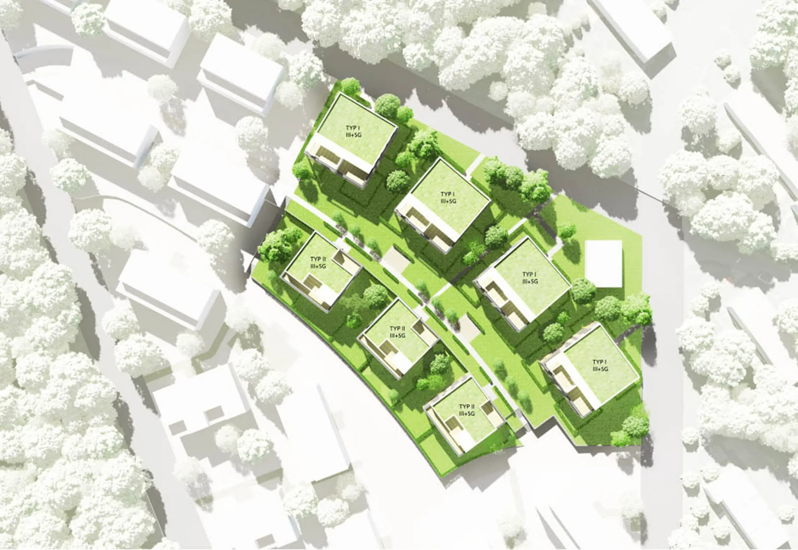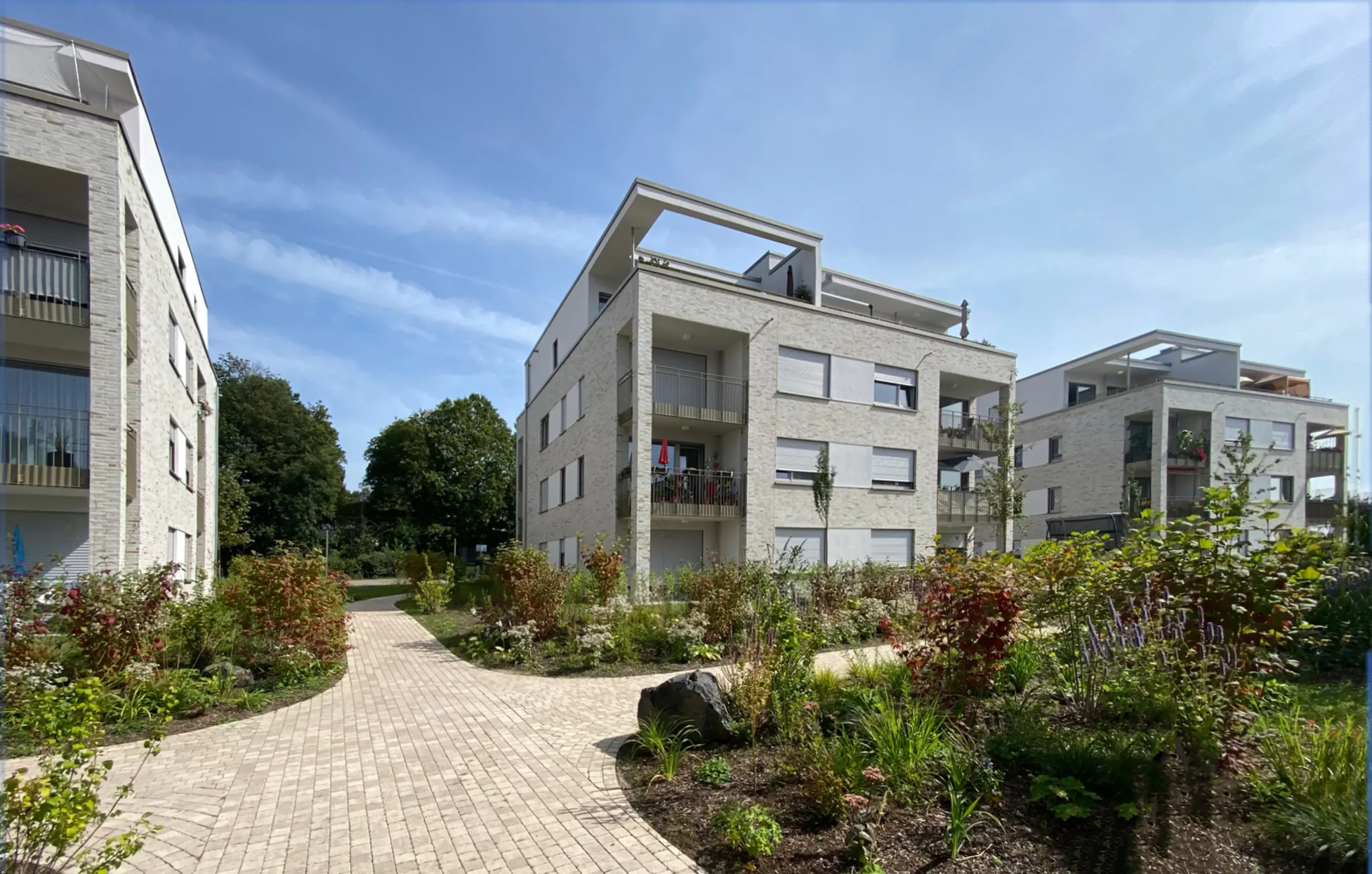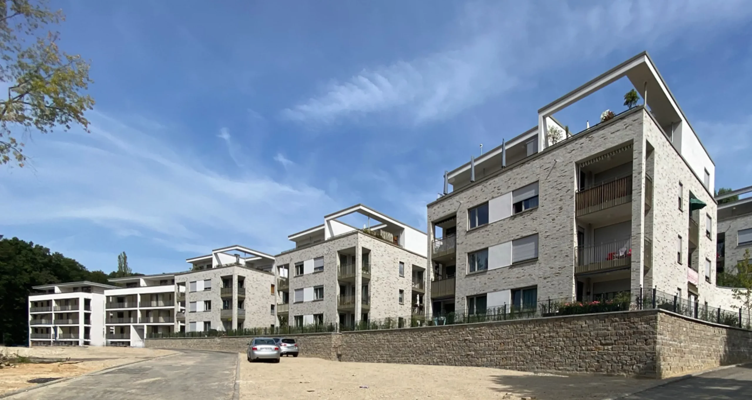 Auf dem Gelände der ehemaligen Altenpflegeeinrichtung wurden sieben kompakte, dreigeschossige Gebäude mit Staffelgeschossen realisiert. Sie folgen dem natürlichen Geländeversprung von bis zu sechs Metern und sind auf zwei Höhenniveaus verteilt – so bieten viele Wohnungen weite Ausblicke ins Weilburger Tal.