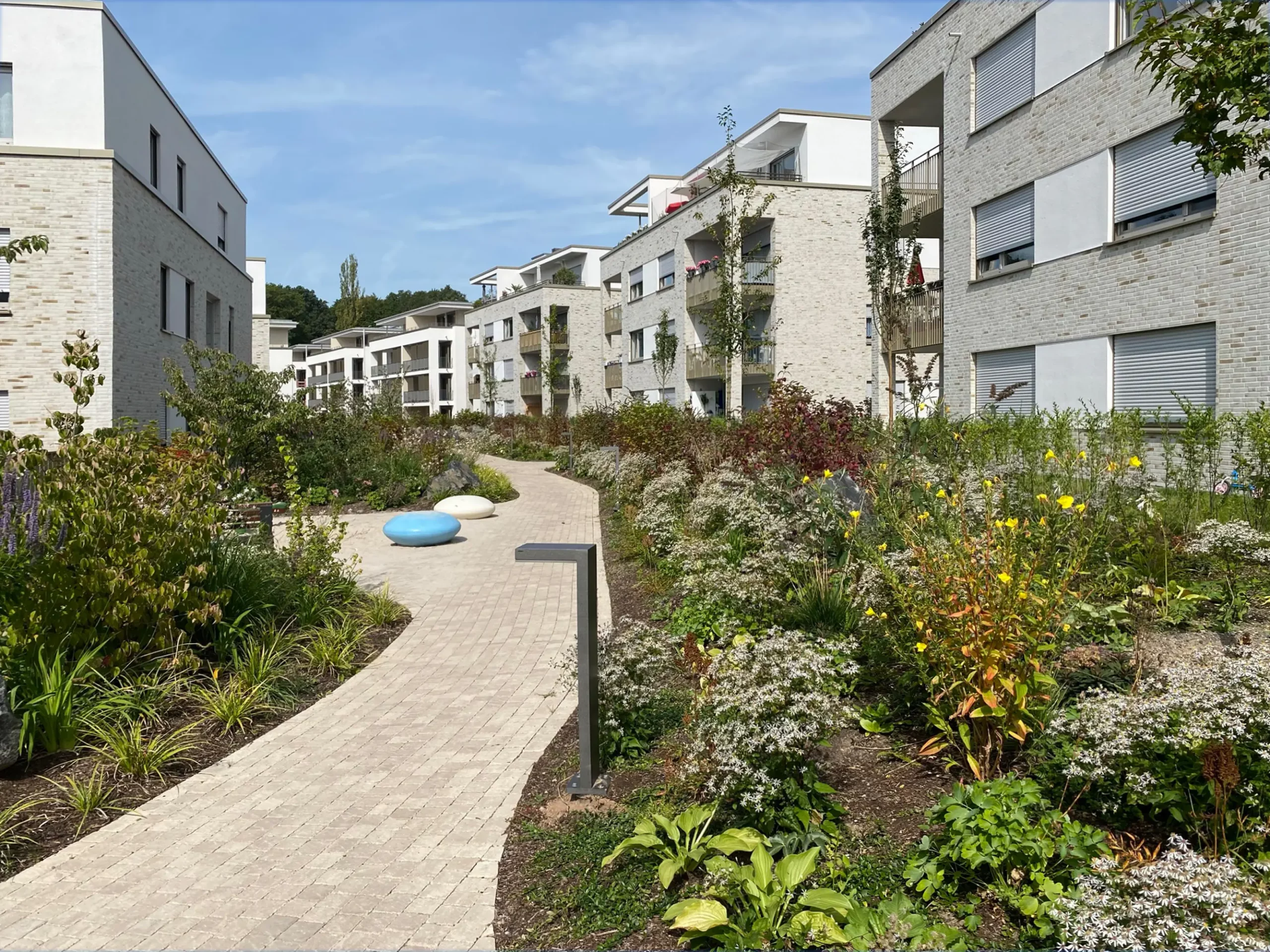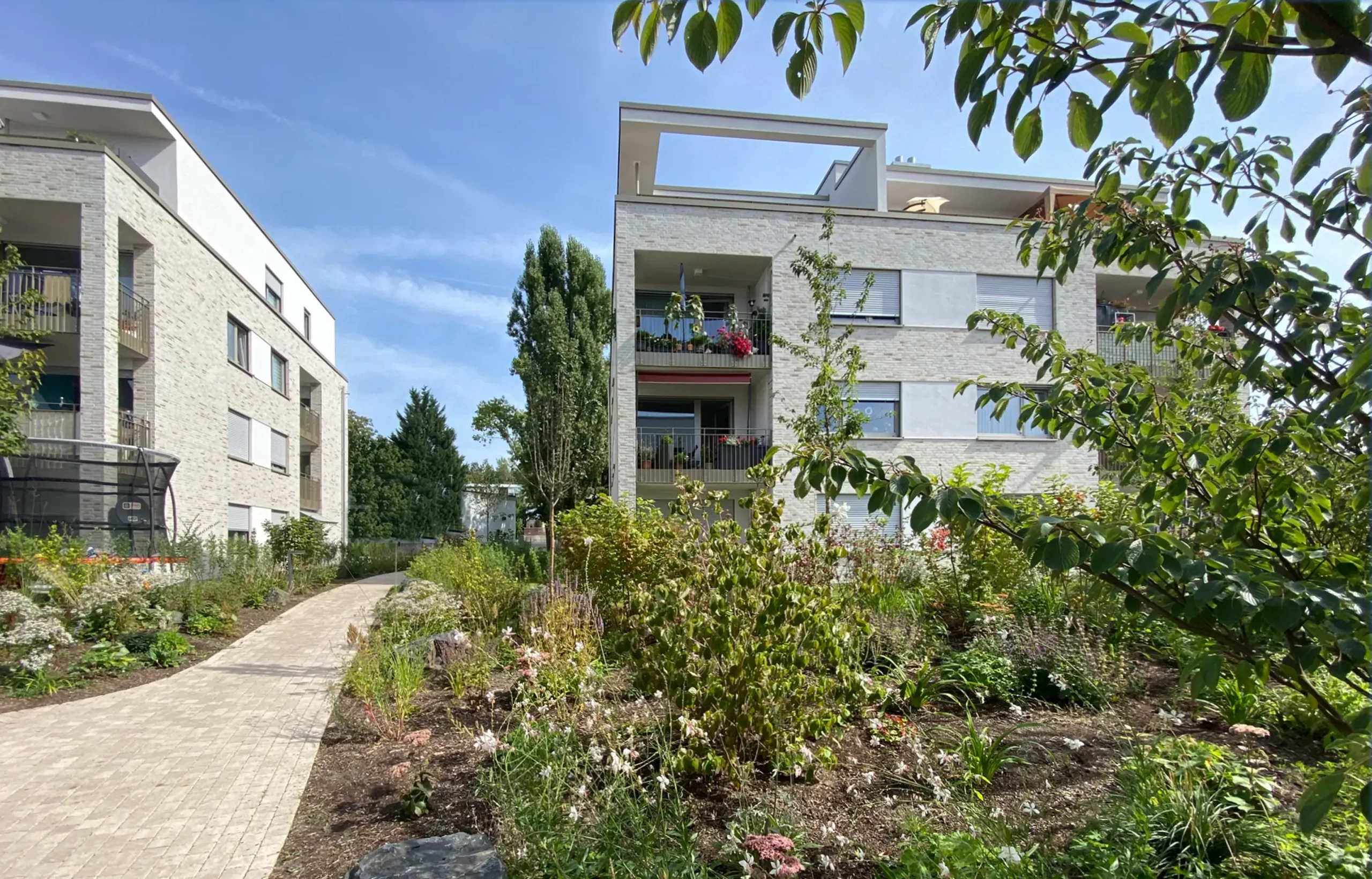 – Private Gärten an den Gebäuden – Offene Aufenthaltsflächen und Spielbereiche – Zonen für Begegnung und gemeinschaftliche Nutzung