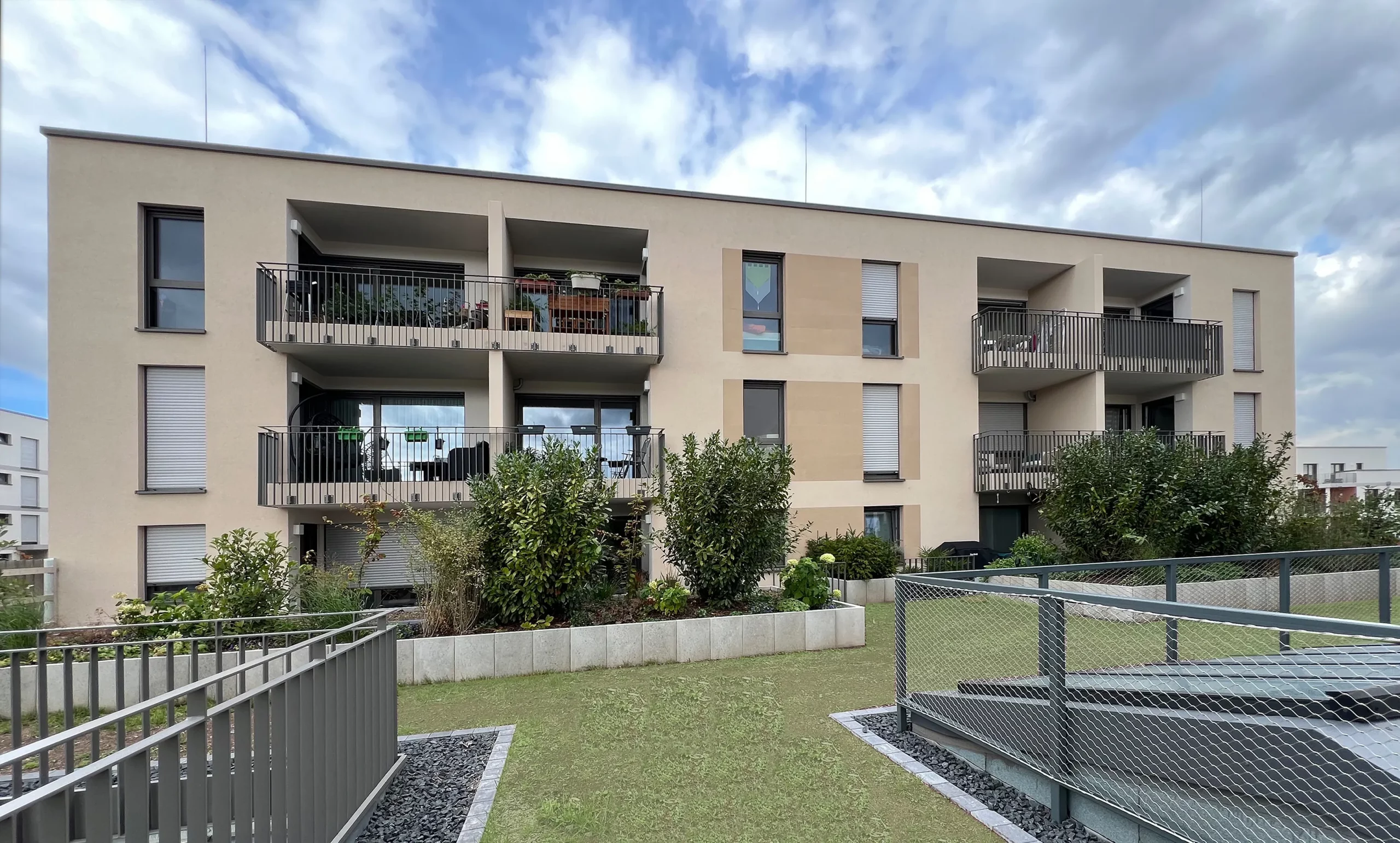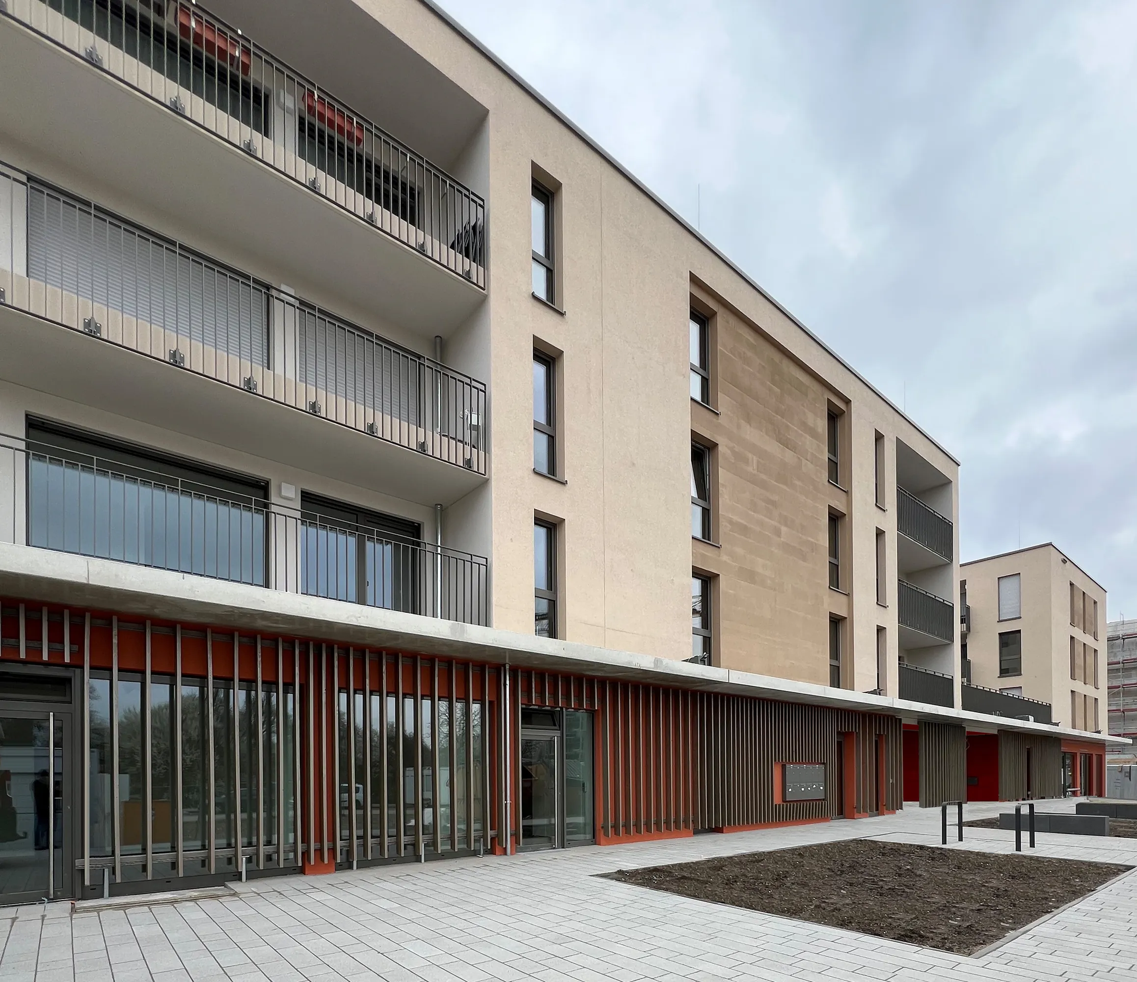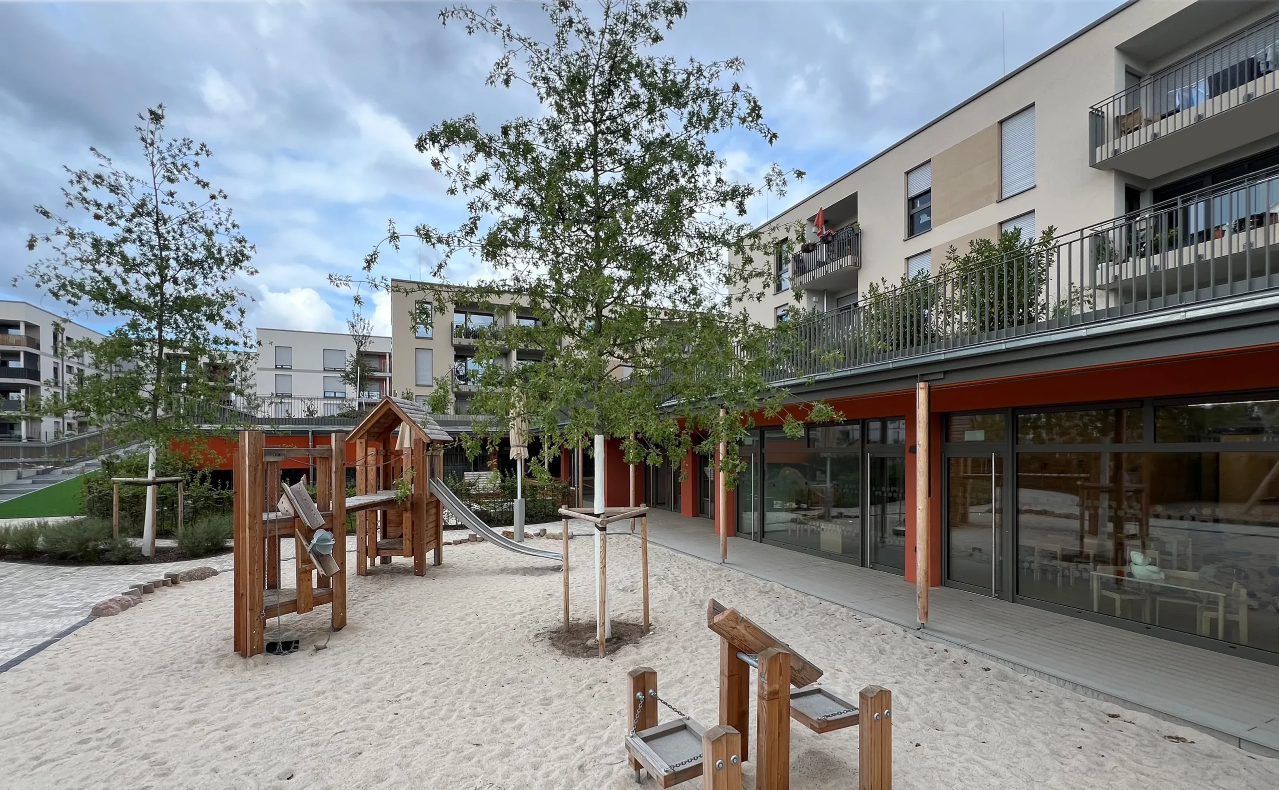 Die drei Gebäude mit jeweils drei Geschossen integrieren im Erdgeschoss eine Kindertagesstätte mit fünf Gruppenräumen. Zusätzlich stehen gemeinschaftlich nutzbare Räume wie ein Waschsalon und eine Fahrradwerkstatt zur Verfügung, die das nachbarschaftliche Miteinander stärken.