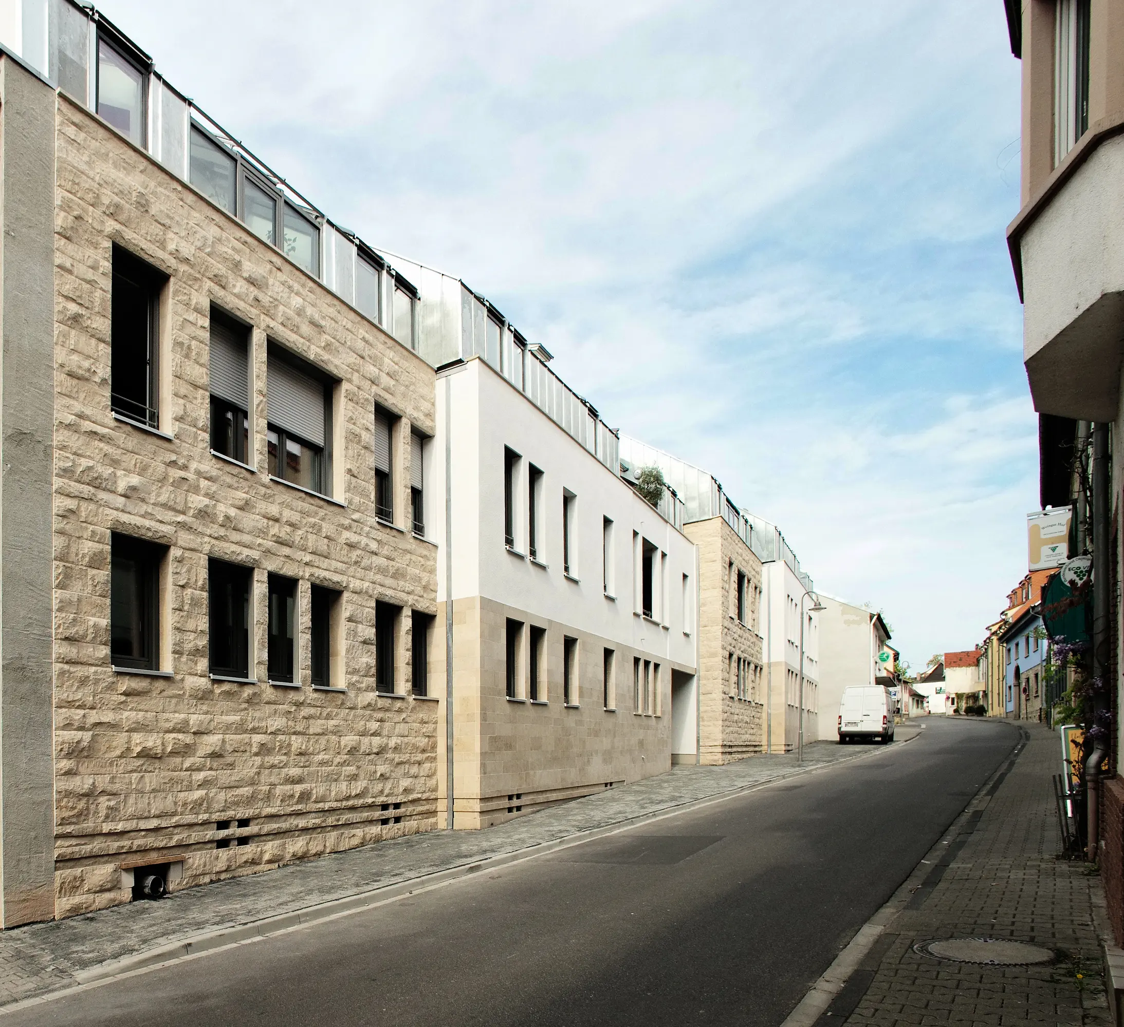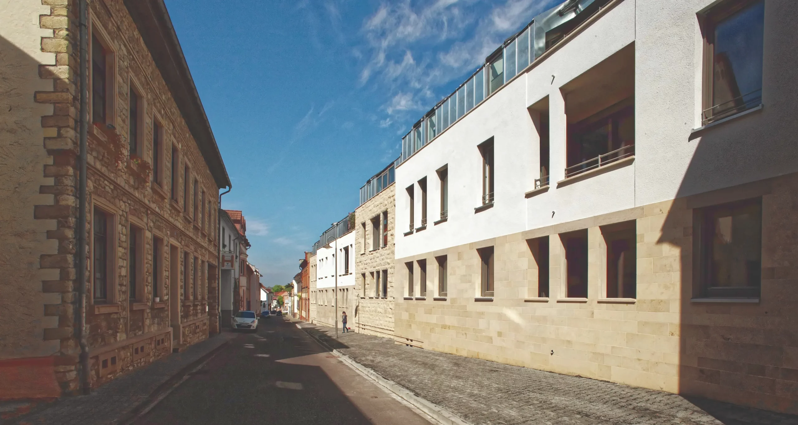Vier Gebäude schließen die Blockkante zur Mainzer Straße und fügen sich mit versetzten Fassadenfluchten und regionaltypischen Materialien in die Umgebung ein. Zur Ottonenstraße hin öffnet sich die Bebauung. Ein öffentlicher Durchgang vernetzt das Quartier mit Krankenhaus, Bibelgarten und Remigiuskirche.