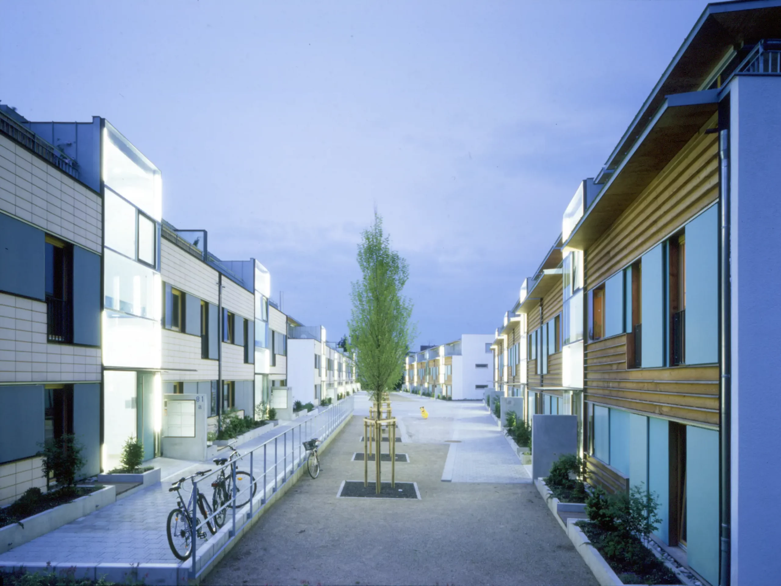 Die vier Häuser orientieren sich in Nord-Süd-Richtung und gruppieren sich um einen gemeinschaftlich genutzten Hof. Die privaten Gärten im Erdgeschoss grenzen an bestehende Gartenflächen, die oberen Wohnungen verfügen über Balkone oder Dachterrassen.