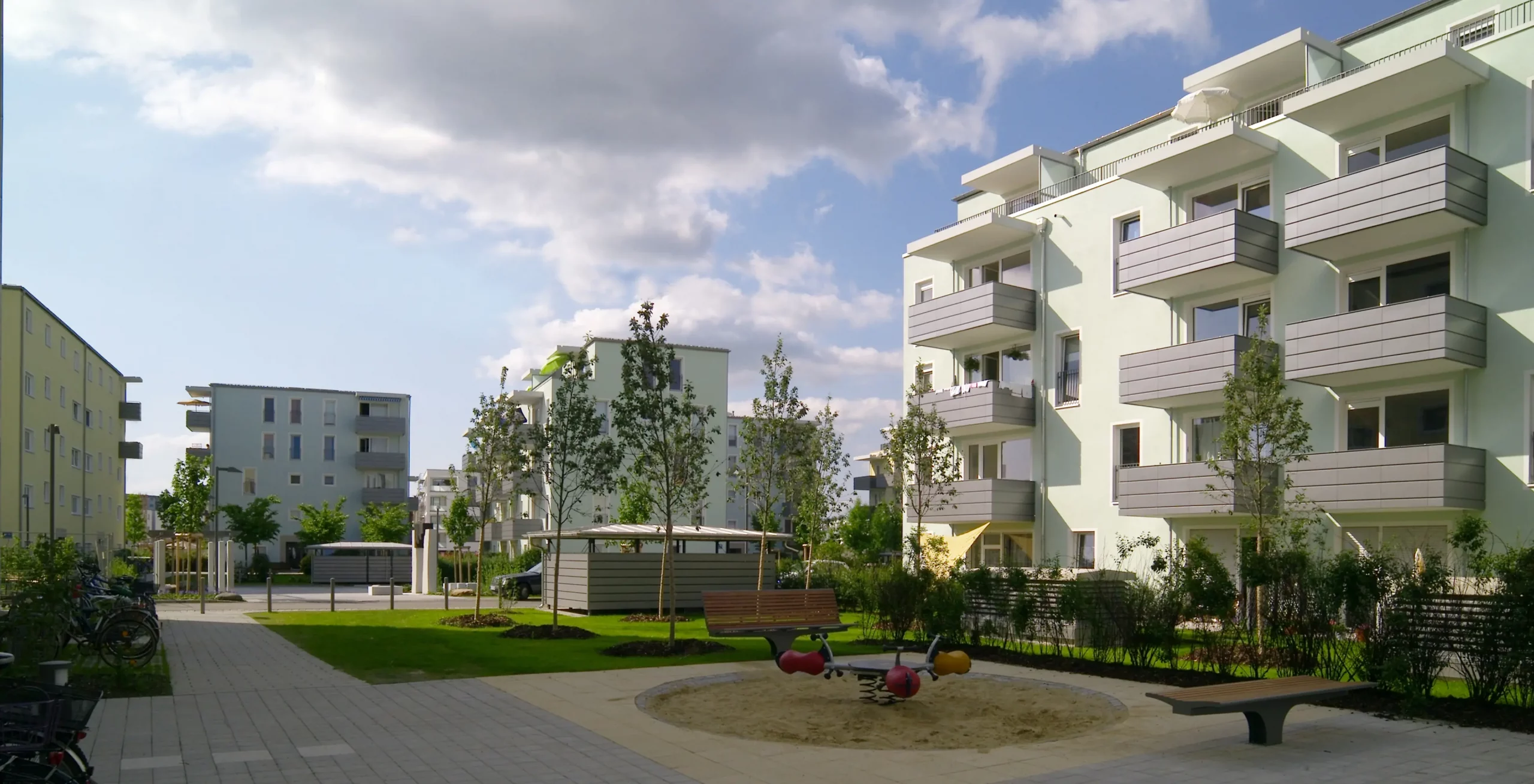 Im Münchner Westen wurde eine Wohnanlage mit 238 Wohnungen für Staatsbedienstete realisiert. Die 16 Gebäude gliedern sich in zwei Bauabschnitte, verbunden durch einen zentralen, halböffentlichen Grünstreifen. Punkt- und Zeilenhäuser in versetzter Anordnung schaffen abwechslungsreiche Höfe, die sich harmonisch mit dem angrenzenden öffentlichen Grünraumverzahnen.